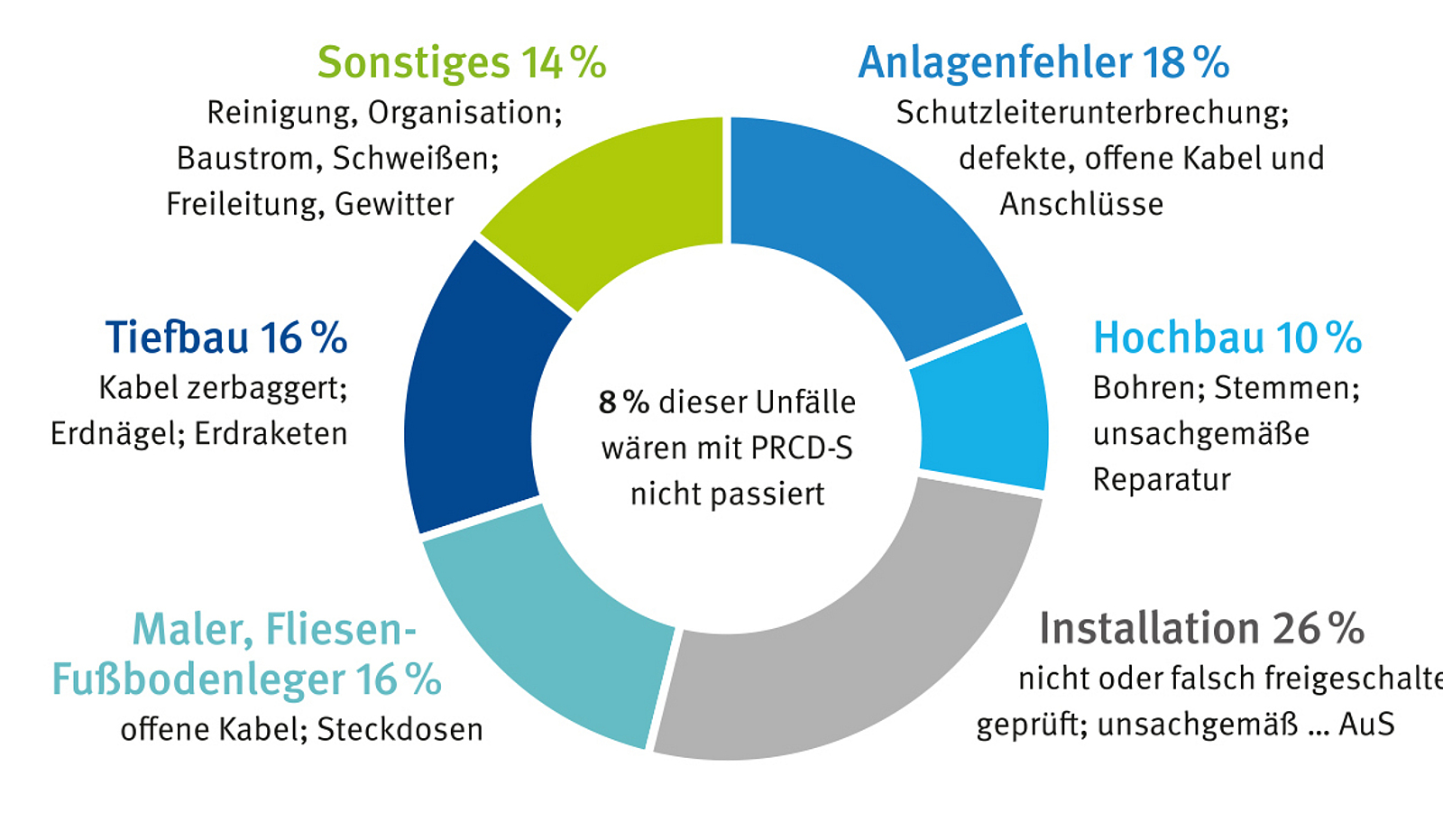 Gewerkeübergreifend kommt es immer wieder zu Unfällen durch defekte Betriebsmittel und mangelhafte Installationen. Schutzleiter sind unterbrochen oder waren nie vorhanden. Anschlussleitungen sind defekt oder stehen ungesichert unter Spannung. Sicherungen funktionieren nicht wie vorgesehen. Fehlerstromschutzeinrichtungen sind nicht installiert. Solche Fehler treten meist nicht an den Baustromverteilungen der Baustellen auf, sondern an unsicheren Kundenanlagen. Die Benutzung einer solchen Steckdose auf einer Baustelle beim Kunden ist ohne besondere Maßnahmen nicht zulässig, weil der Status der Steckdose und der damit verbundenen Schutzmaßnahme nicht bekannt sind. Im Berichtszeitraum wurden 14 vermeidbare Unfälle ermittelt, die durch solche unsicheren Steckdoseninstallationen verursacht bzw. mit verursacht wurden.
