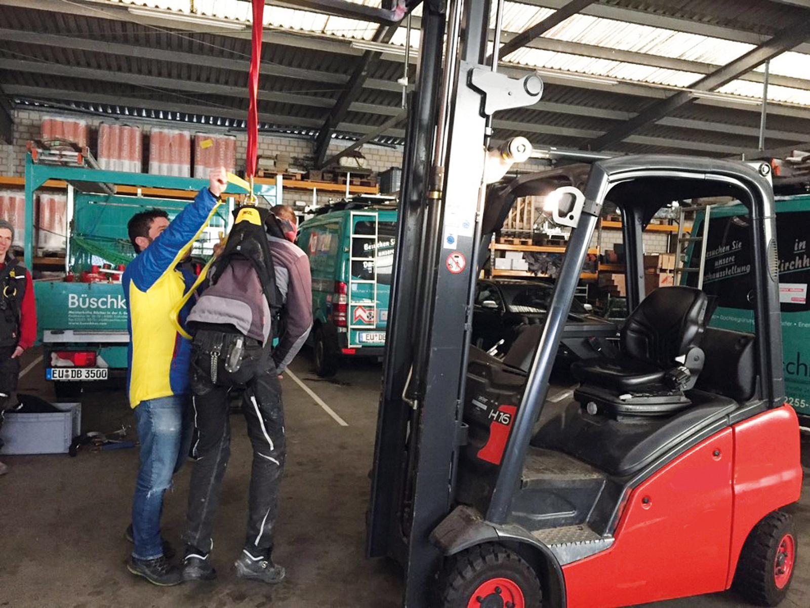Der Ordner enthält umfangreiche Informationen, Checklisten und Muster und ermöglicht es vor allem kleineren Betrieben, den Anforderungen an Arbeitsschutzmaßnahmen gerecht zu werden. Viertens: Die Umsetzung der Arbeitsschutzmaßnahmen. Bei Büschkes haben beispielsweise alle Mitarbeiter an einer Unterweisung für persönliche Schutzausrüstung gegen Absturz (PSAgA) teilgenommen. Und fünftens: Die Einbindung des sicheren Verhaltens in den Alltag. Im Dachdeckerbetrieb von André Büschkes ist das inzwischen selbstverständlich, sicherlich vor allem, weil es von ihm auch vorgelebt wird.