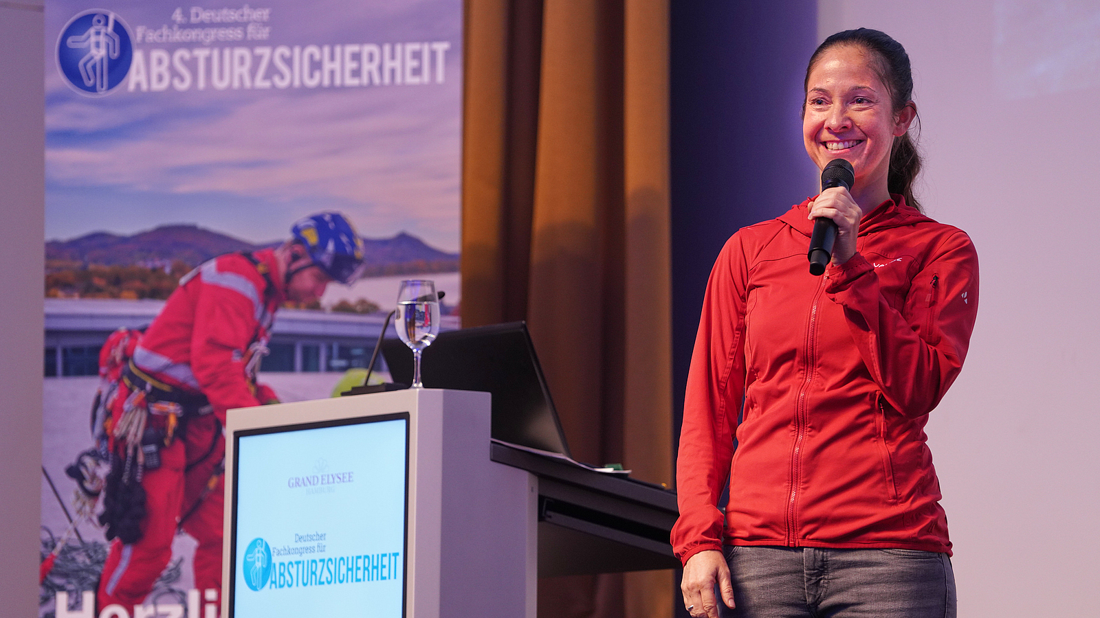 Den Abschluss und Höhepunkt des 4. Deutschen Fachkongresses für Absturzsicherheit bildete der Vortrag von Ulla Lohmann, die unter der Überschrift „Ich mach das jetzt! Meine Reise zum Mittelpunkt der Erde“ ihren ganz eigenen Bezug zum Thema Absturz vorstellte. Die Geografin, Expeditionsfotografin und Vulkanforscherin berichtete nicht nur von ihrer Zeit bei indigenen Völkern in Papua-Neuguinea, wo sie spezielle Riten, Tiere und Pflanzen kennenlernte, sondern vor allem von ihren Abseil-Aktionen in zum Teil aktive Vulkane der Insel. Um diese Vulkane auch wieder sicher zu verlassen, war es für sie unabdingbar, technische Ausrüstung sowie eigenes Verhalten und Vermögen immer wieder auf den Prüfstand zu stellen.