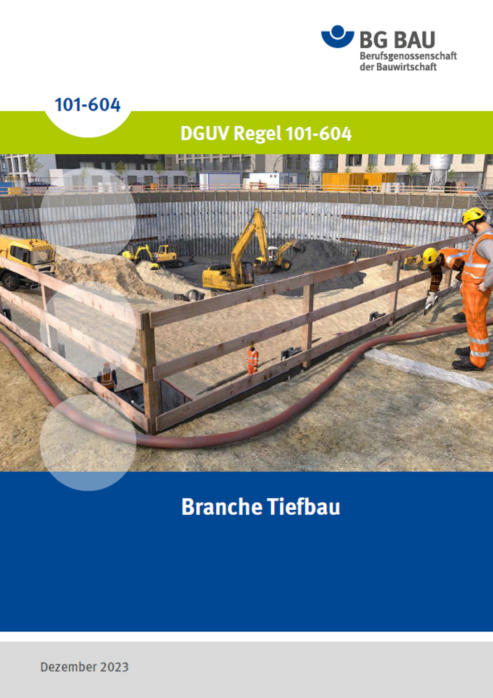 Im Oktober 2019 wurde die DGUV Regel 101-604 „Branche Tiefbau“ veröffentlicht, die konkrete Hilfe bei den Arbeitsschutzmaßnahmen im Rahmen von Tiefbauarbeiten bietet. Die Branchenregel, an der auch das Referat Tiefbau der BG BAU maßgeblich mitgearbeitet hat, stellt umfassend die wichtigsten präventiven Möglichkeiten vor, um die gesetzlich vorgeschriebenen Schutzziele für die Unternehmen und deren Belegschaften zu erreichen. Zum einem werden übergreifende Themen wie die sichere Benutzung von Baumaschinen, persönliche Schutzausrüstungen oder auch Kampfmittelräumung behandelt. Zum anderen werden auch einzelne Arbeitsbereiche im Tiefbau, wie z. B. Straßenbau, Arbeiten im Bereich von Baugruben und Gräben sowie Spezialtiefbauarbeiten, betrachtet. Abgerundet wird das Arbeitsschutz-Kompendium für die Tiefbau-Branche durch verschiedene Formularvorlagen, z. B. zur Beauftragung von Erdbaumaschinenführern. Mit dieser DGUV Regel werden in erster Linie Unternehmerinnen und Unternehmer angesprochen, die für die Sicherheit und Gesundheit ihrer Beschäftigten verantwortlich sind. Aber durch den hohen Praxisbezug bietet die DGUV Regel auch großen Nutzen für alle weiteren Akteurinnen und Akteure in Tiefbauunternehmen, etwa den Personal- und Betriebsräten, den Fachkräften für Arbeitssicherheit, den Betriebsärztinnen und -ärzten sowie den Sicherheitsbeauftragt.