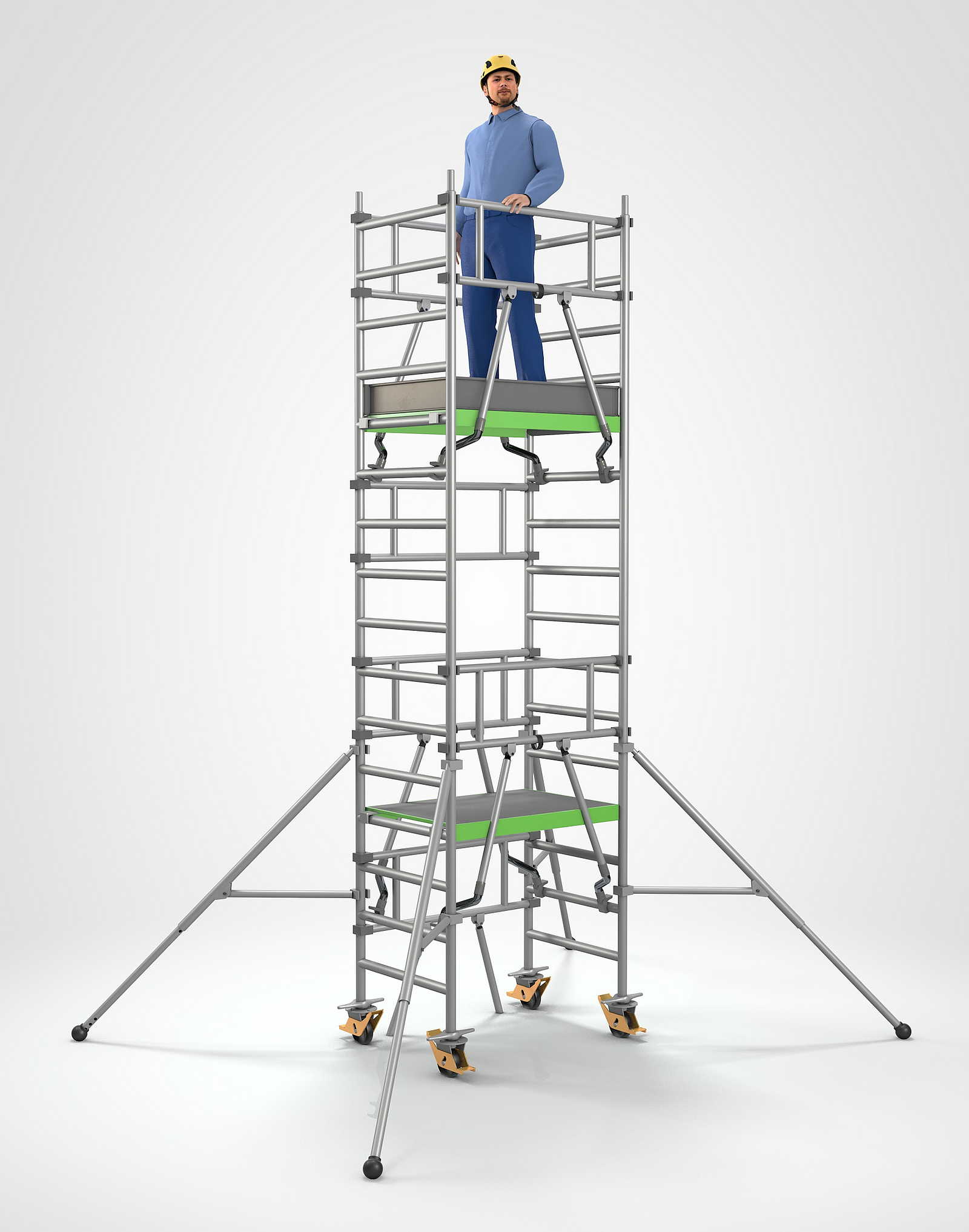 Die mobilen Ein-Personen-Gerüste als Alternative zu Leitern sind leicht zu transportieren und von einer Person auf- oder abzubauen. Sie gewährleisten einen sicheren Standplatz für hochgelegene Arbeiten von bis zu ca. 6 m Arbeitshöhe. Der Aufbau erfolgt Schritt für Schritt von der untersten Plattform kommend. Ein-Personen-Gerüste können leicht – in der Regel ohne Werkzeug – zu einem Gerüstwagen mit Rollen umgebaut und dank ihrer kompakten Maße in normalen Nutzfahrzeugen transportiert werden.