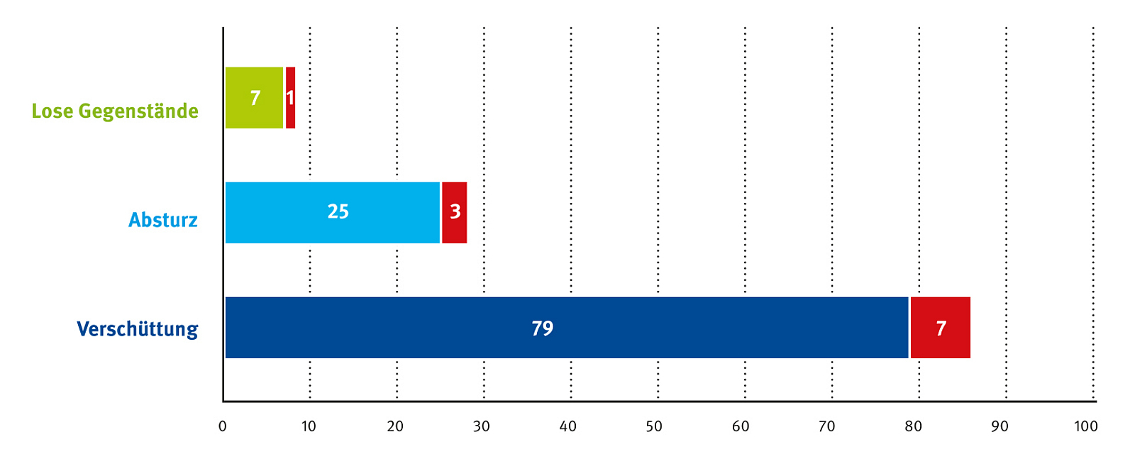In Abbildung 1 (oben) sind die von der BG BAU ermittelten wesentlichen Unfallarten in dem hier beschriebenen Segment dargestellt. Die Unfallzahlen beziehen sich auf den Zeitraum von 2017 bis November 2019. Der Anteil der tödlichen Unfälle ist in rot dargestellt.