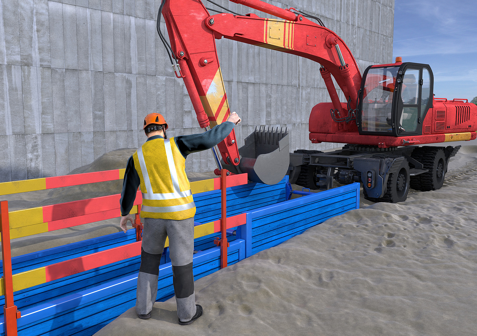 Da im unmittelbaren Arbeitsbereich des Baggers, z. B. beim Einbau und Rückbau des Verbaus, das Herstellen einer Absturzsicherung in der Regel nicht möglich ist, kann gemäß der Branchenregel Tiefbau [5] (Konkretisierung des § 12 (4) der UVV „Bauarbeiten“) an Grabenrändern, in den Grabenabschnitten, die sich in Bearbeitung befinden oder in denen gearbeitet wird und dabei eine Beschickung vom Grabenrand aus notwendig ist, auf eine Absturzsicherung verzichtet werden. Das gilt in der Regel für die Tätigkeiten Grabenaushub, Einbringen des Verbaus, Leitungsverlegung, Verfüllung und Rückbau des Verbaus“ (Abb. 5). Der Verzicht auf eine Maßnahme gegen Absturz muss nachvollziehbar in der Gefährdungsbeurteilung der Baumaßnahme begründet sein.
