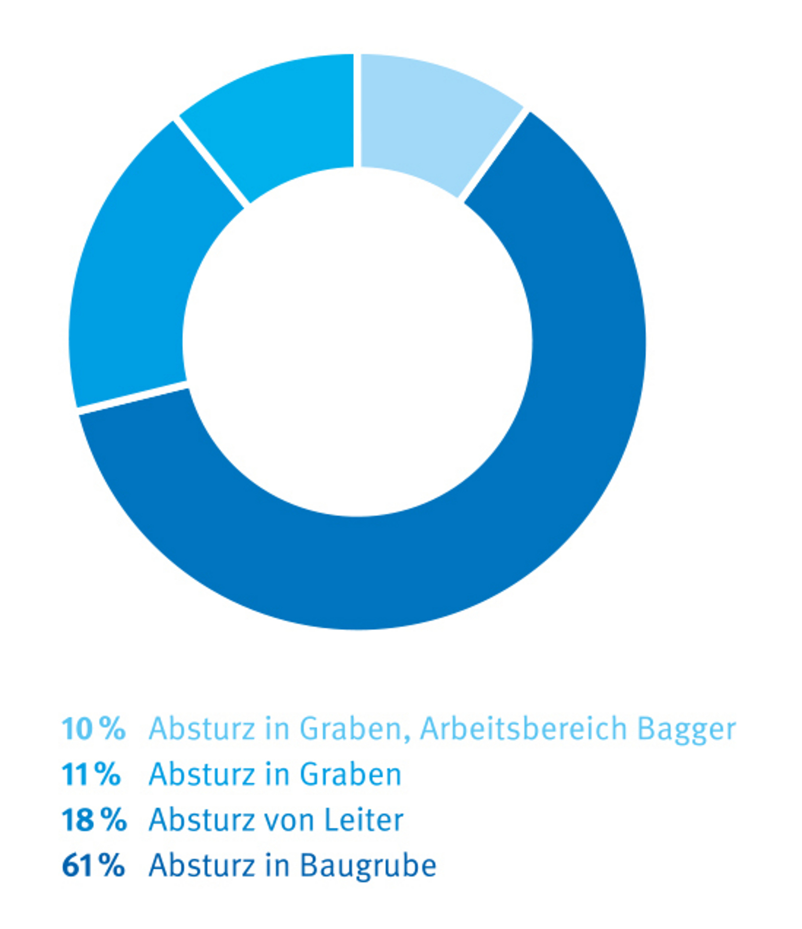 Die Verteilung der Absturzunfälle im Bereich der Ränder von Baugruben und Gräben ist in Abbildung 4 dargestellt. Unfälle, die z. B. von einer Geschossdecke eines Bauwerks in eine offene Baugrube hinein passieren, sind hier nicht erfasst. Den größten Anteil haben die Absturzunfälle in Baugruben hinein, gefolgt von Absturzunfällen vom Baugrubenrand in die Baugrube hinein (insgesamt 21 %). Diese unterteilen sich in solche, die im Arbeitsbereich des Baggers, am „frisch“ eingerichteten Graben passieren (10 %), und solche, die im weiteren Grabenverlauf passieren (11 %). Absturzunfälle von Leitern, die in diesen Bereichen in der Regel als Verkehrsweg genutzt werden haben einen Anteil von 18 %.