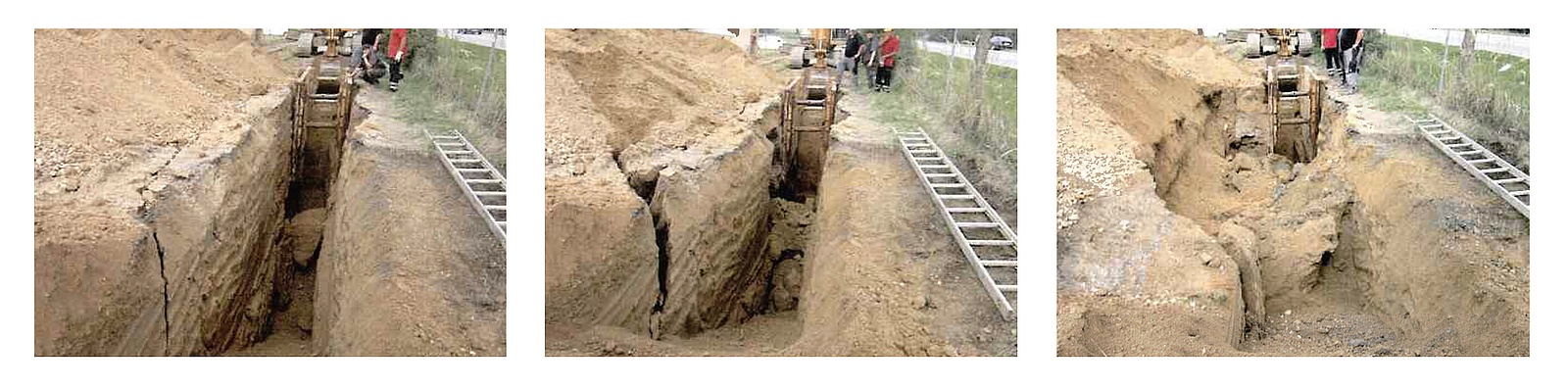 Die Fotostrecke im Abbildung 7 zeigt eindrucksvoll das Versagen einer ungesicherten Erdwand. Unmittelbar nachdem ein Mitarbeiter der Prävention der BG BAU die Mitarbeiter des Unternehmens aus dem ungesicherten Teil des Grabens „gebeten“ hatte, versagte die Erdwand. Das Versagen der Erdwand geschieht lautlos und plötzlich, ohne sich vorher anzukündigen. Man kann sich bildlich vorstellen, welche Auswirkungen die eingebrochenen Erdmassen auf Personen im Graben gehabt hätten. In diesem Fall musste anschließend „nur“ der Graben neu angelegt werden.