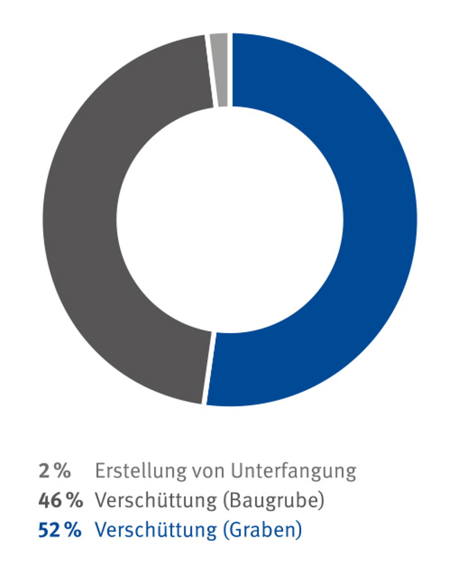Abbildung 2 zeigt die prozentuale Verteilung dieser Unfälle. Die Zahlen zeigen, dass die Verschüttung von Personen mit 70 % die Hauptunfallursache in diesem Bereich darstellt und knapp ein Viertel dieser Unfälle auf eine der Hauptunfallursachen auf Baustellen zurückzuführen ist, den Absturz. In der Regel passieren diese Unfälle, weil bekannte Sicherungsmaßnahmen nicht oder nicht richtig umgesetzt werden und eine Sicherheit vorausgesetzt wird („Der Boden steht doch!“), die nur scheinbar vorhanden ist. Insgesamt muss bei den Akteuren am Bau, den Bauherren, Planern, Unternehmern und Mitarbeitern eine größere Sensibilität gegenüber den Gefahren im Bereich von Baugruben- und Grabenwänden entstehen. Alle zusammen müssen in ihrem jeweiligen Verantwortungsbereich dafür Sorge tragen, dass die Baugruben und Gräben so hergestellt werden, dass Unfälle möglichst vermieden werden.