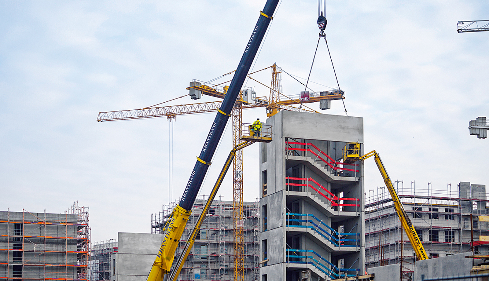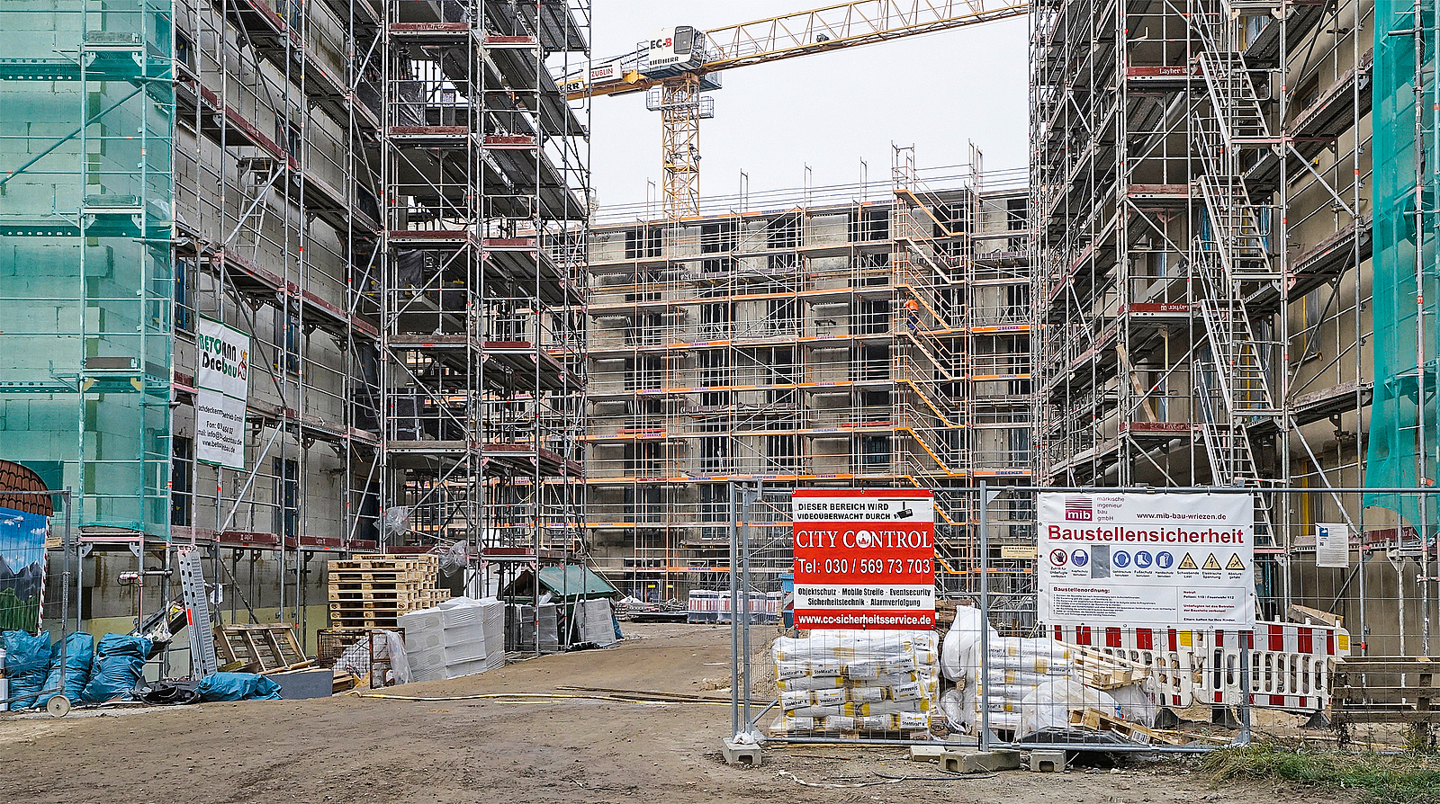 Den Auftrag als Generalübernehmer für das Bauvorhaben Zossener Straße erhielten die ANES Bauausführungen Berlin GmbH sowie die mib märkische ingenieur bau GmbH, Wriezen. Frank Brödermann von der mib ist als Verantwortlicher für Einkauf, Ausschreibung und Vergabe von Anfang an in das Projekt einbezogen und weiß, was Verdichtung, was Bauen auf einer Brache mitten in einem Wohngebiet bedeutet. „Wir müssen für die neuen Wohngebäude die gesamte Infrastruktur neu schaffen, einschließlich Straßen, Elektro-, Wasser- und Abwasserleitungen, und sie mit bestehenden Medien des Umfelds verbinden. Das alles mit unterschiedlichen und zahlreichen Verhandlungspartnern, in engster Nachbarschaft zu anderen Wohnhäusern, neben Straßenbahnen, stark befahrenen Straßen, Autobahnzubringern und unter Coronavirus-Bedingungen. Alle Gewerke müssen deshalb bis ins kleinste Detail genau nach Plan aufeinander abgestimmt werden. 15 Baukräne arbeiten zeitgleich koordiniert. Betonfertigteile sowie Mischbeton müssen taktgenau geliefert werden, damit sich auf den engen Baustraßen niemand behindert und der öffentliche Verkehr nicht so stark beeinflusst wird. Eine Aufgabe, die uns täglich neu fordert. Vor allem logistisch.“