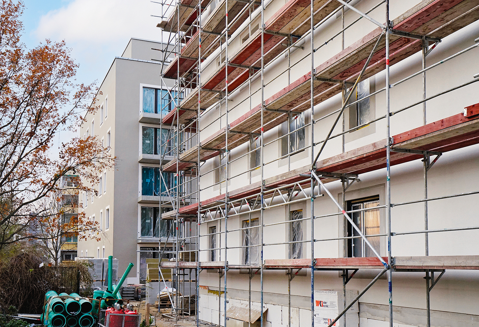 Die Konstruktion aller Gebäude in monolithischer Bauweise aus gedämmten Hochlochziegeln führt zu einer energieeffizienten Gebäudehülle mit optimierten Lebenszykluskosten entsprechend dem KfW-Standard 55. Zur Wärmedämmung der Fassade dient ein mineralisches Wärmeverbundsystem (etwa 20 cm dick), das auf die Außenwand gedübelt wird. Dicht an dicht verlegte Platten sorgen für die nötige ununterbrochene Wärmedämmung. Denn jedes Leck hätte Wärmeverlust und sogar Schimmel zur Folge. Darauf folgt grobkörniger Putz im Wechsel mit glattem, was später die gestalterische Vielfalt in der Fassadenansicht hervorbringt.