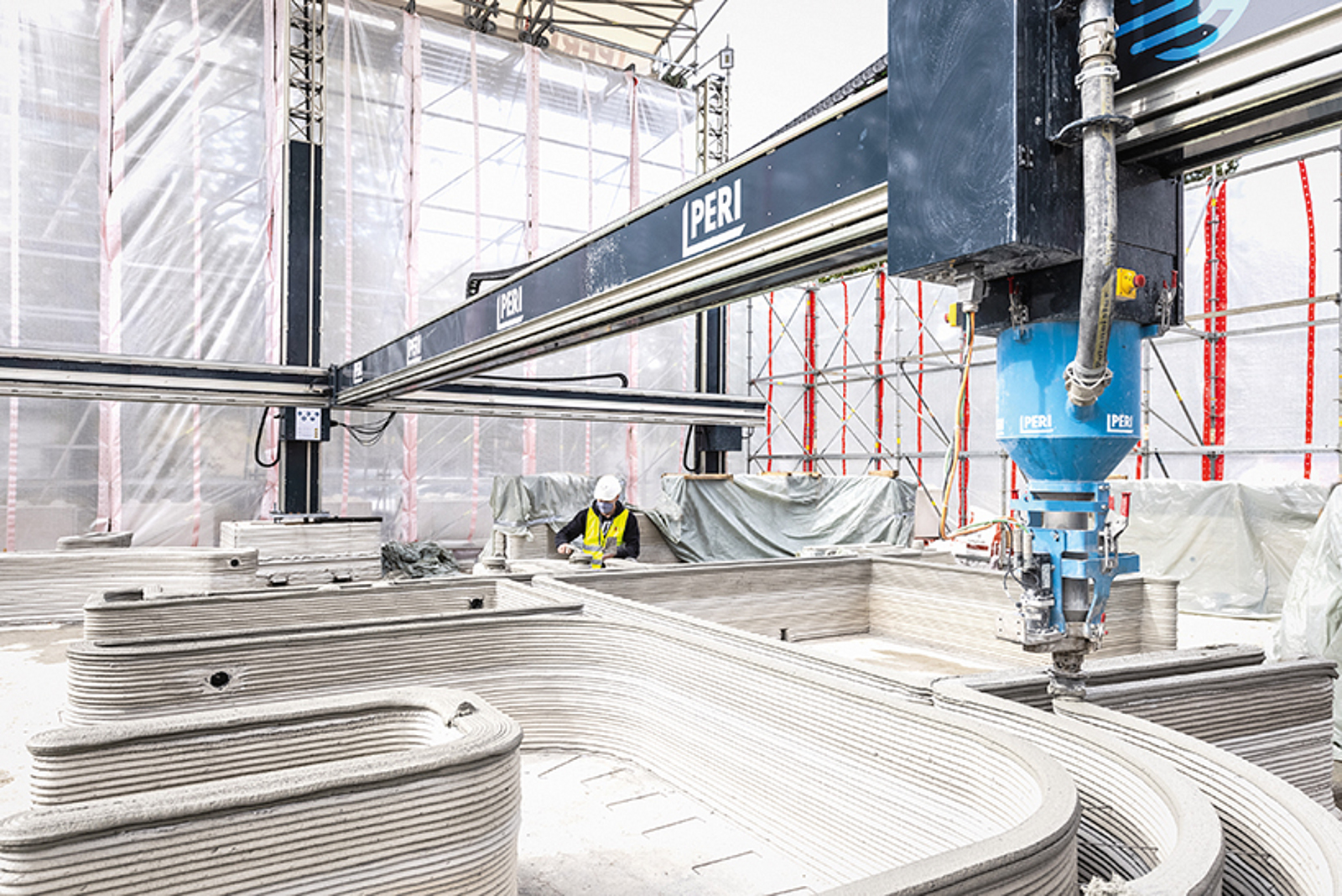 PERI setzt zum Druck in Beckum 3D-Drucker vom Typ BOD2 ein. Diese Drucktechnologie stammt vom dänischen Hersteller COBOD, an dem PERI bereits seit 2018 beteiligt ist. Der BOD2 ist ein Portaldrucker, d. h., der Druckkopf bewegt sich über drei Achsen auf einem fest installierten Metallrahmen. Vorteil dieses Drucktyps: Der Drucker kann sich in seinem Rahmen an jede Position innerhalb der Konstruktion bewegen und muss nur einmal kalibriert werden. Das zum Druck eingesetzte Material „i.tech 3D“ wurde von HeidelbergCement speziell für den 3D-Druck entwickelt. Seine Eigenschaften sind angepasst auf die besonderen Anforderungen des 3D-Drucks mit Beton, es ist gut pumpbar und extrudierbar und harmoniert sehr gut mit dem BOD2.