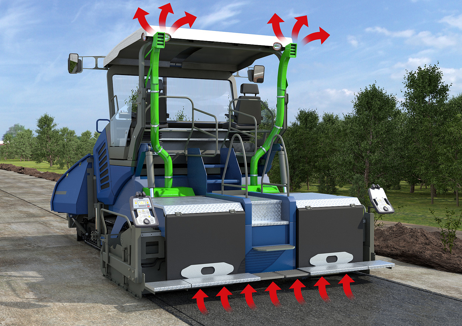 Absaugeinrichtungen an Asphaltfertigern dienen der Reduzierung der Belastungen durch Dämpfe und Aerosole beim Einbau von Walzasphalt. Gefördert wird die Nachrüstung von Bestandsmaschinen.