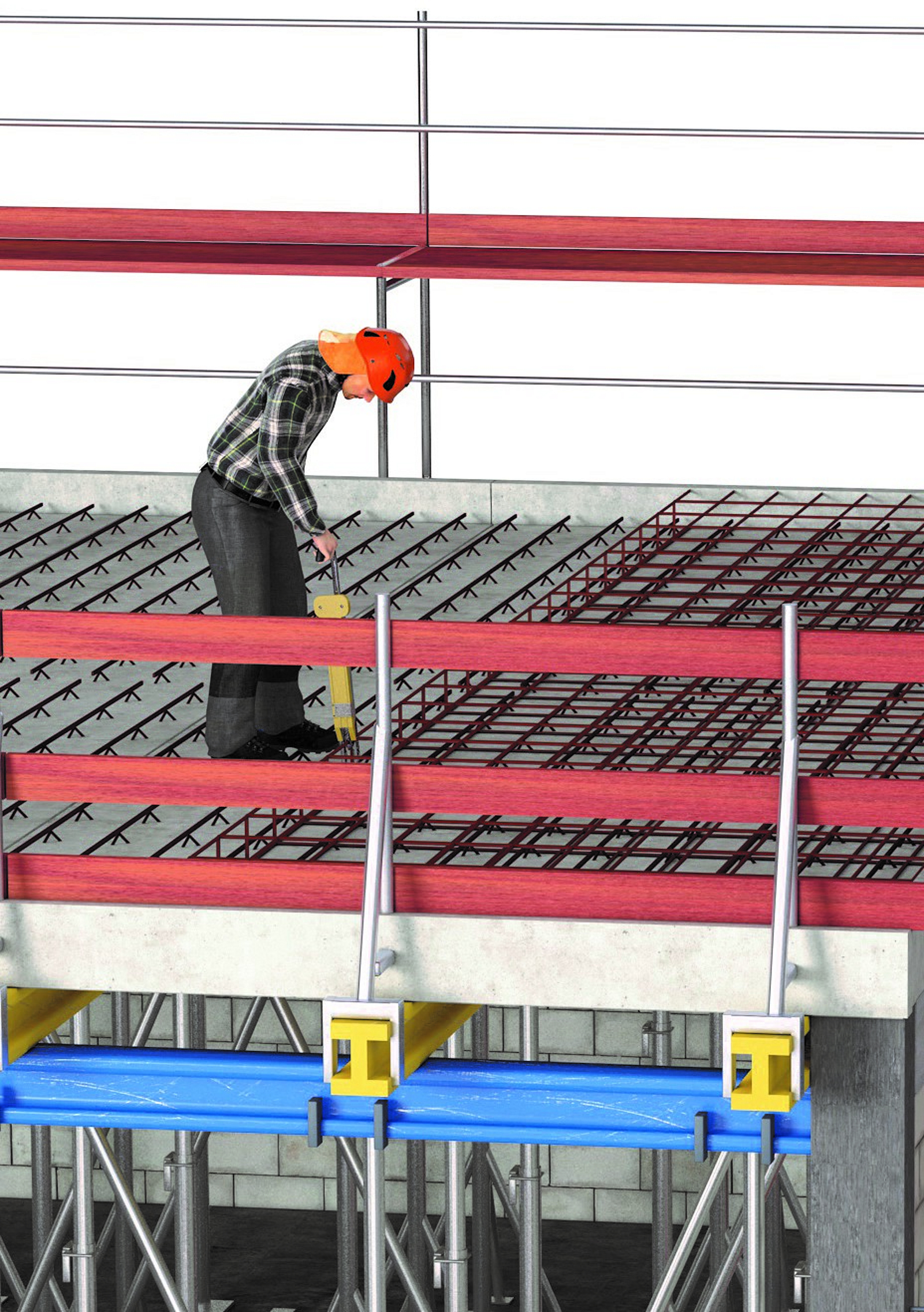 Um Absturzunfälle von Deckenkanten, Treppenöffnungen oder Spundwand-, Schalungs- oder Verbauoberkanten zu reduzieren, wird bevorzugt ein temporärer Seitenschutz als technische Maßnahme zur kollektiven Absicherung von Absturzkanten auf Baustellen eingesetzt. Für dieses Seitenschutzsystem werden individuell gefertigte oder vorgefertigte Bauteile genutzt. Temporäre Seitenschutzsysteme bestehen aus Abschalschienen, Schalungskonsolen, Universalzwingen, Spundwandzwingen, Pfosten und Verbindungsmitteln oder (Schraub-)Hülsen, die in den frischen Beton eingedrückt werden. Gefördert werden die Anschlussteile und Pfosten (vertikales Haupttragteil für das Seitenschutzsystem) und nur Systeme einer Herstellerfirma (keine Vermischung verschiedener Typen). Seitenschutzgitter, Seitenschutznetze und Geländerbretter werden nicht gefördert.