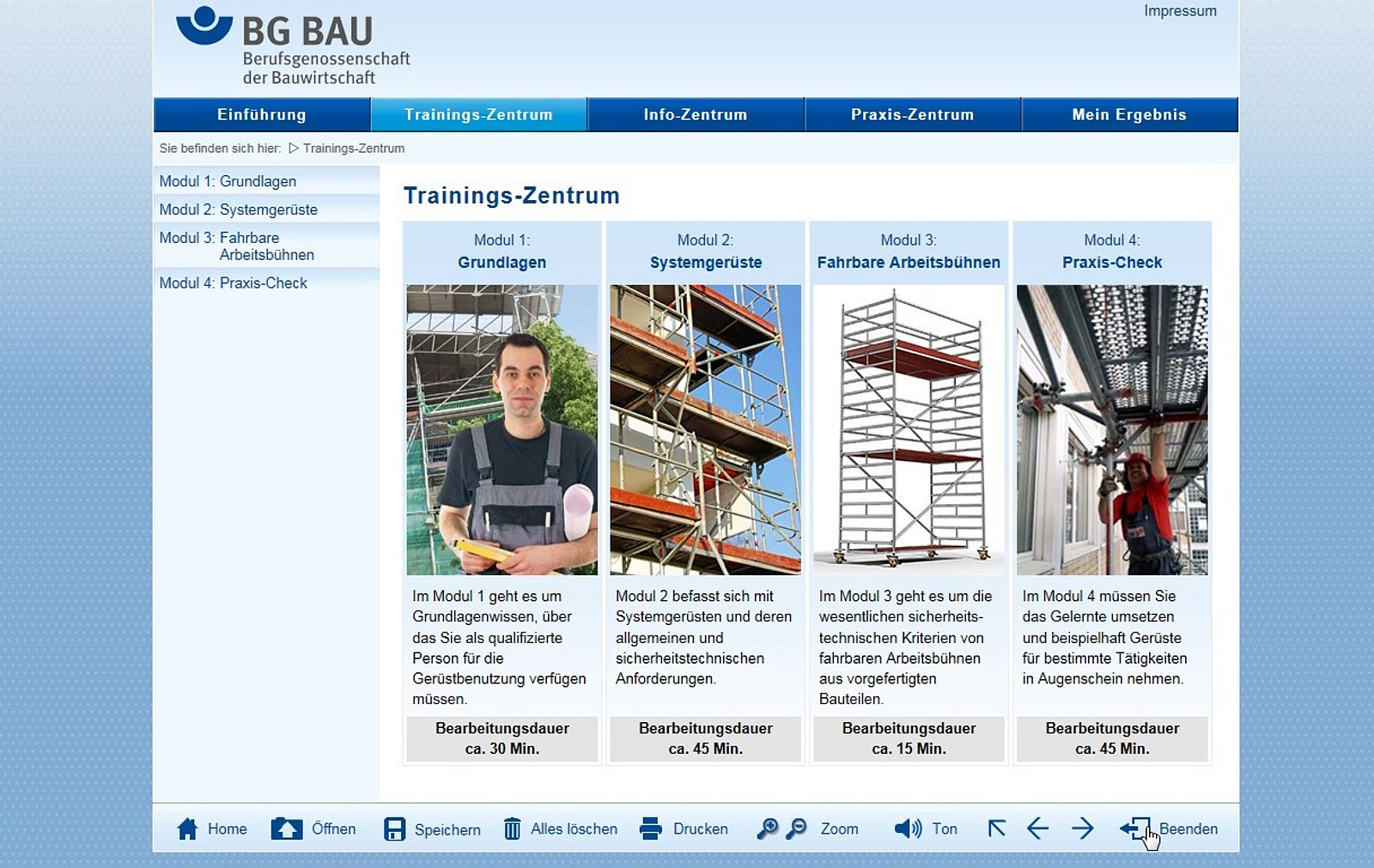 Im „Trainings-Zentrum“ können sich die qualifizierten Personen weiteres Wissen zu den Themen „Grundlagen“, „Systemgerüste“ und „Fahrbare Arbeitsbühnen“ aneignen und ihr Wissen testen. Beim abschließenden „Praxis-Check“ müssen sie das Gelernte umsetzen und Gerüste für bestimmte Tätigkeiten beispielhaft kontrollieren. Im „Info-Zentrum“ finden sich alle für die Gerüstnutzung wichtigen Verordnungen, BG-Vorschriften und Technischen Regeln im Originaltext. Außerdem stehen Hintergrundinformationen zum Umgang mit Arbeits- und Schutzgerüsten und weitere Informationen zu den unterschiedlichen Gerüstarten zur Verfügung. Darüber hinaus befinden sich im „Praxis-Zentrum“ Arbeitshilfen für die Praxis, wie zum Beispiel ein Muster eines Protokolls für die Inaugenscheinnahme vor dem Gebrauch durch gerüstnutzende Personen, ein beispielhafter Plan für den Gebrauch und vieles mehr.