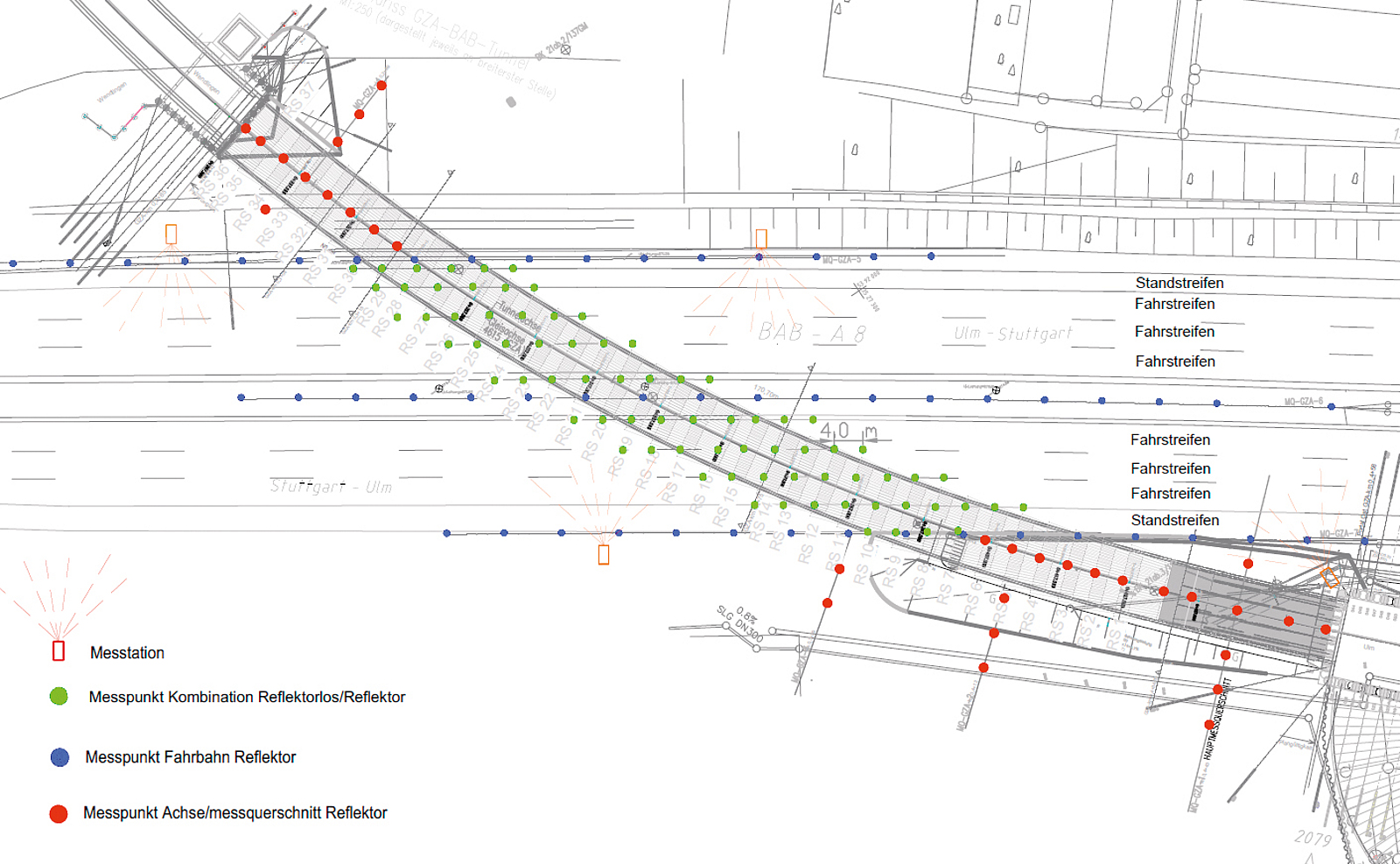 Jedes Tachymeter mit Kommunikationseinheit ist eine Messstation. Für die Messung im Bereich der A 8 werden vier Messstationen mit ca. 4 m Höhe gegenüber den zu messenden Objekten errichtet. Die Messstationen werden neben der Fahrbahn auf der nördlichen und südlichen Autobahnseite errichtet, um die Fahrbahnränder auf der Innenseite und auch die gegenüberliegenden Messpunkte im Mittelstreifen der Autobahn und auf den Fahrspuren entlang der Tunnelachse erfassen zu können.