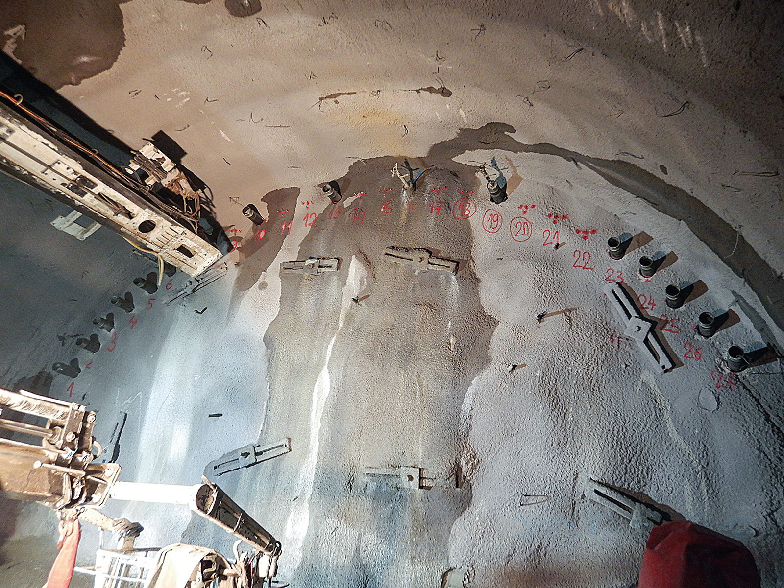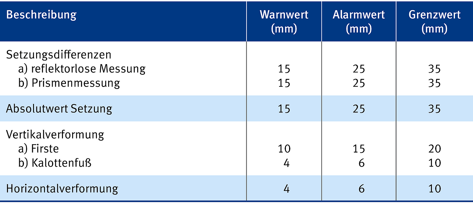 Die untertägigen Messpunkte werden an die obertägige Lage der Messpunkte entsprechend dem 4-m-Takt der Rohrschirmhertellung angepasst und ca. 80 cm hinter dem vorangegangenen Rohrschirmansatzpunkt angeordnet. Die Warn-, Alarm- und Grenzwerte sind in Tabelle 1 definiert.