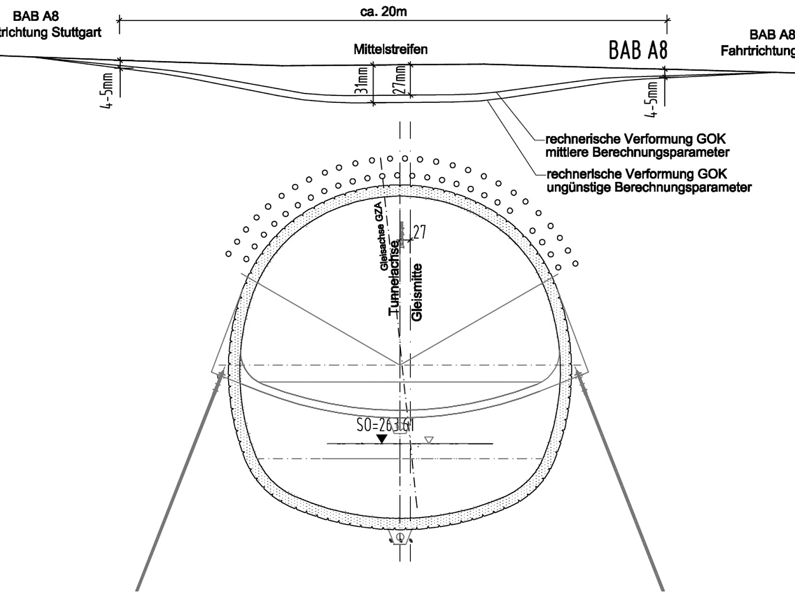 Prinzipskizze über rechnerische Verformungen (Projekt "Unterfahrung der A8 mittels Lockergesteinsvortrieb")