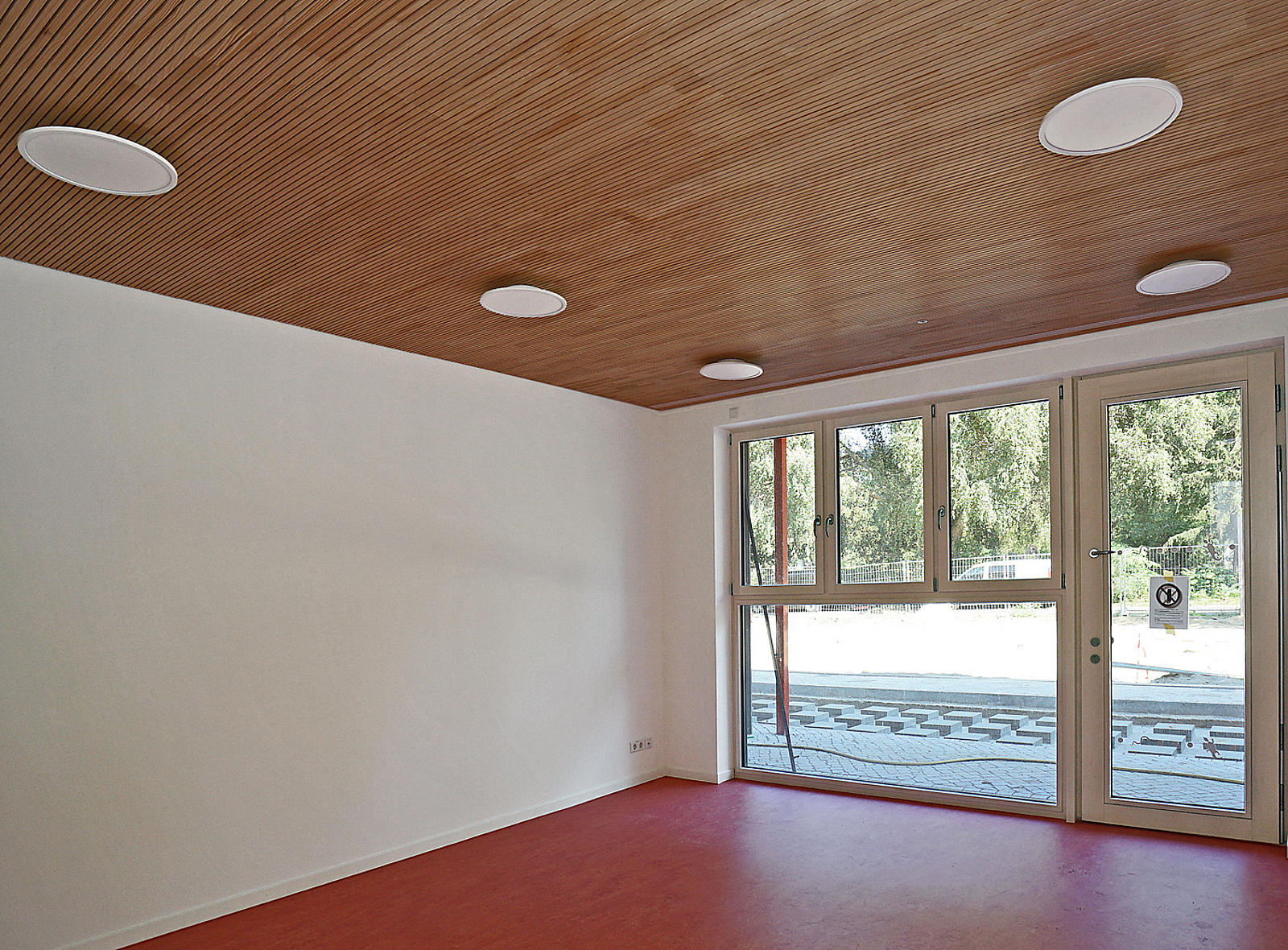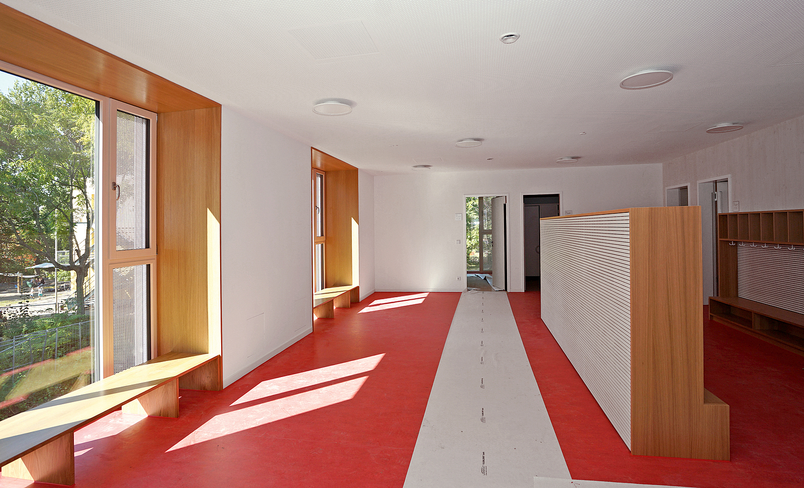 Auch in den Innenräumen dominiert Holz bei Vorsatzschalen, Akustikdecken, Treppen und Garderoben. Das schafft eine gemütliche, kindgerechte Atmosphäre. Die Geschosse bestehen aus großzügigen Aufenthaltsräumen, die auch auf großflächigen Fluren viel Raum zum Spielen und Bewegen bieten. Obwohl sich die Holzkonstruktion aller Kitas gleicht, unterscheiden sie sich innen und äußerlich in der Farbgestaltung und symbolisieren dabei die Elemente Erde, Feuer, Wasser und Luft. Der vorgefertigte Laubengang mit Sonnendach in der Harnackstraße leuchtet zum Beispiel rot wie Feuer. Die Laubengänge dienen dabei nicht nur als Verbindungs-, sondern außerdem als zweiter Fluchtweg. Was die Frei- und Spielanlagen ringsum betrifft, rundet die Terrasse aus unbehandeltem Eichenholz das attraktive Ensemble ab.