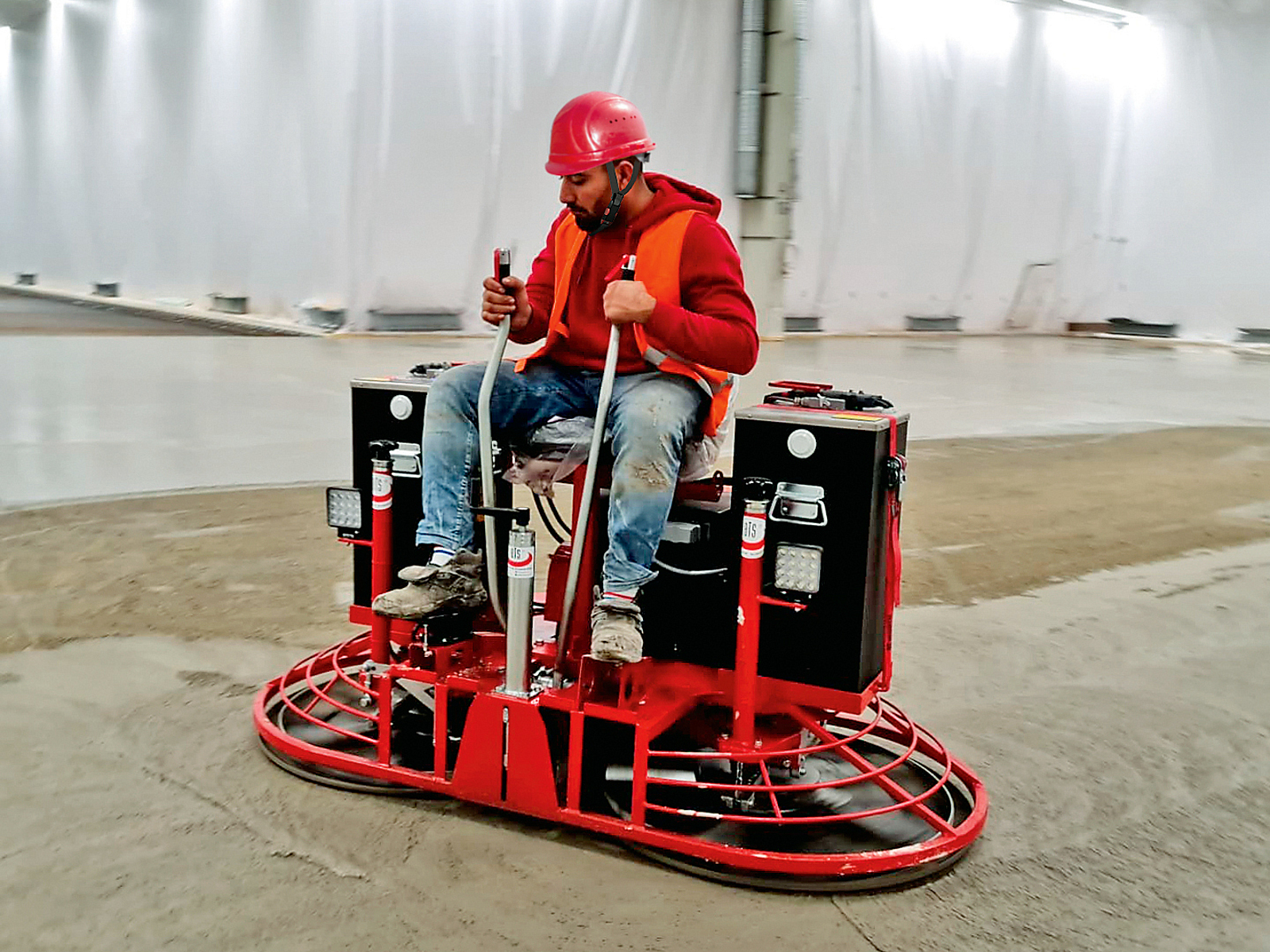 Die Arbeiten auf der Baustelle mussten bei laufendem Betrieb ausgeführt werden. Zudem gab es keine Öffnungen in dem Raum, nur eine Tür, die jedoch direkt zu den Arbeitsplätzen des Betriebs führte. Der Einsatz von Glättern mit Verbrennungsmotor war daher ausgeschlossen. Zudem standen auf der Baustelle weder Kran noch andere Hebehilfen für den Transport der Maschinen zur Verfügung.