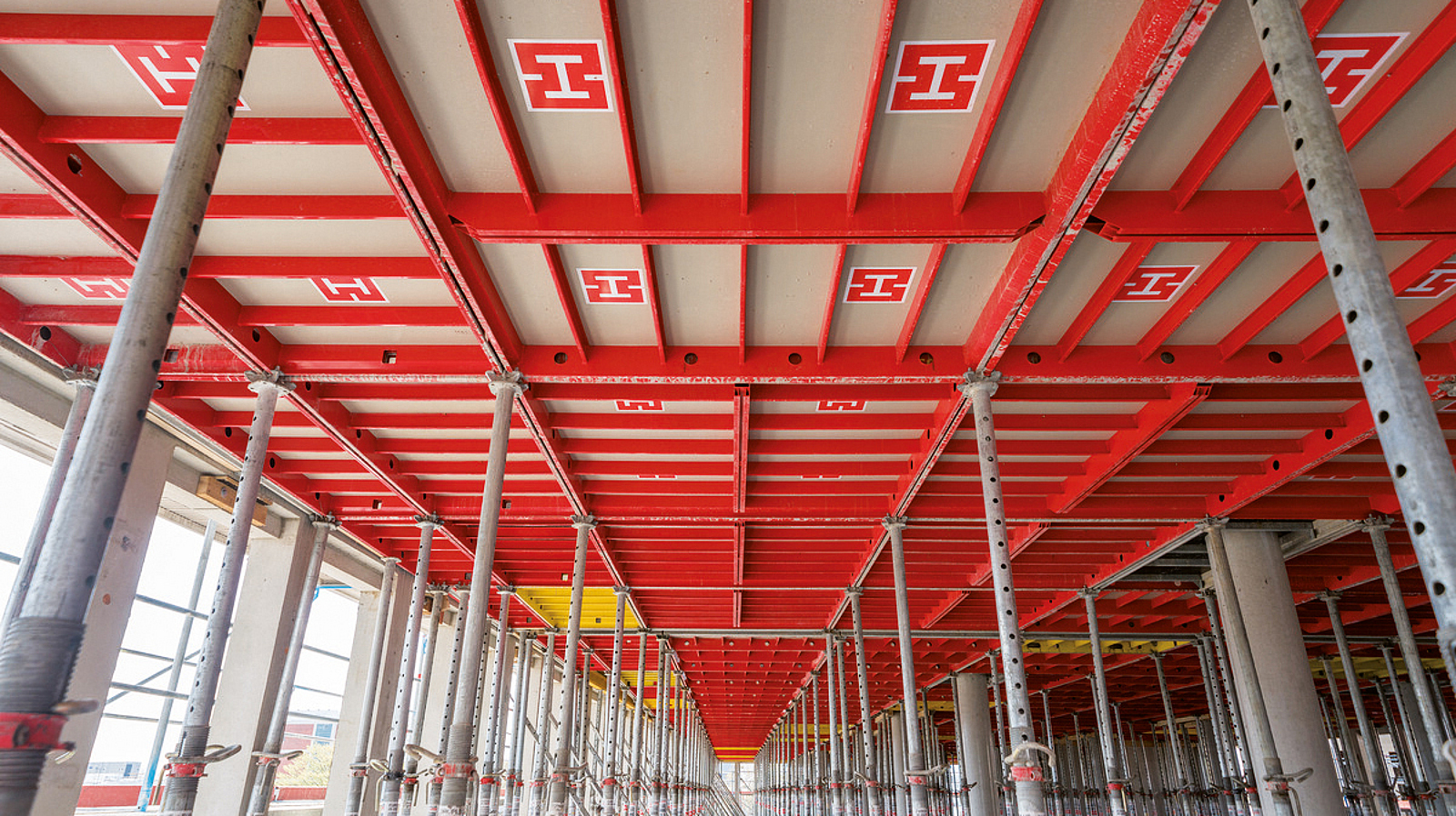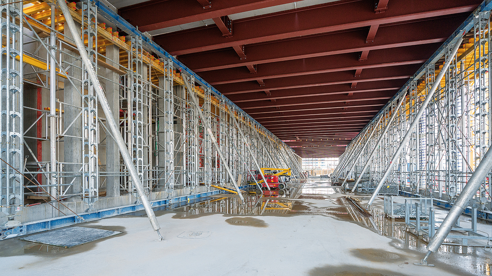 Für Deckenflächen mit besonders hohen Lasten oder komplexer Geometrie hat Hünnebeck die Baustelle mit der Topflex-Holzträgerschalung ausgestattet. Rund 37.000 laufende Meter H-20-Träger für insgesamt rund 9.000 m² Schalfläche werden an vielen Stellen in Kombination mit dem Aluminium-Tragsystem Gass eingesetzt. Es hat eine Tragfähigkeit von bis zu 140 kN pro Stiel und kann sicher aus nur drei Grundkomponenten montiert werden. Damit erfüllt Gass genau die Bedingungen, auf die das Baustellenteam Wert legt.