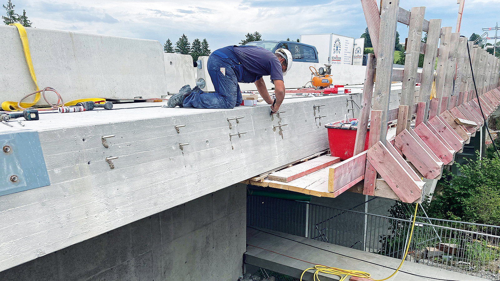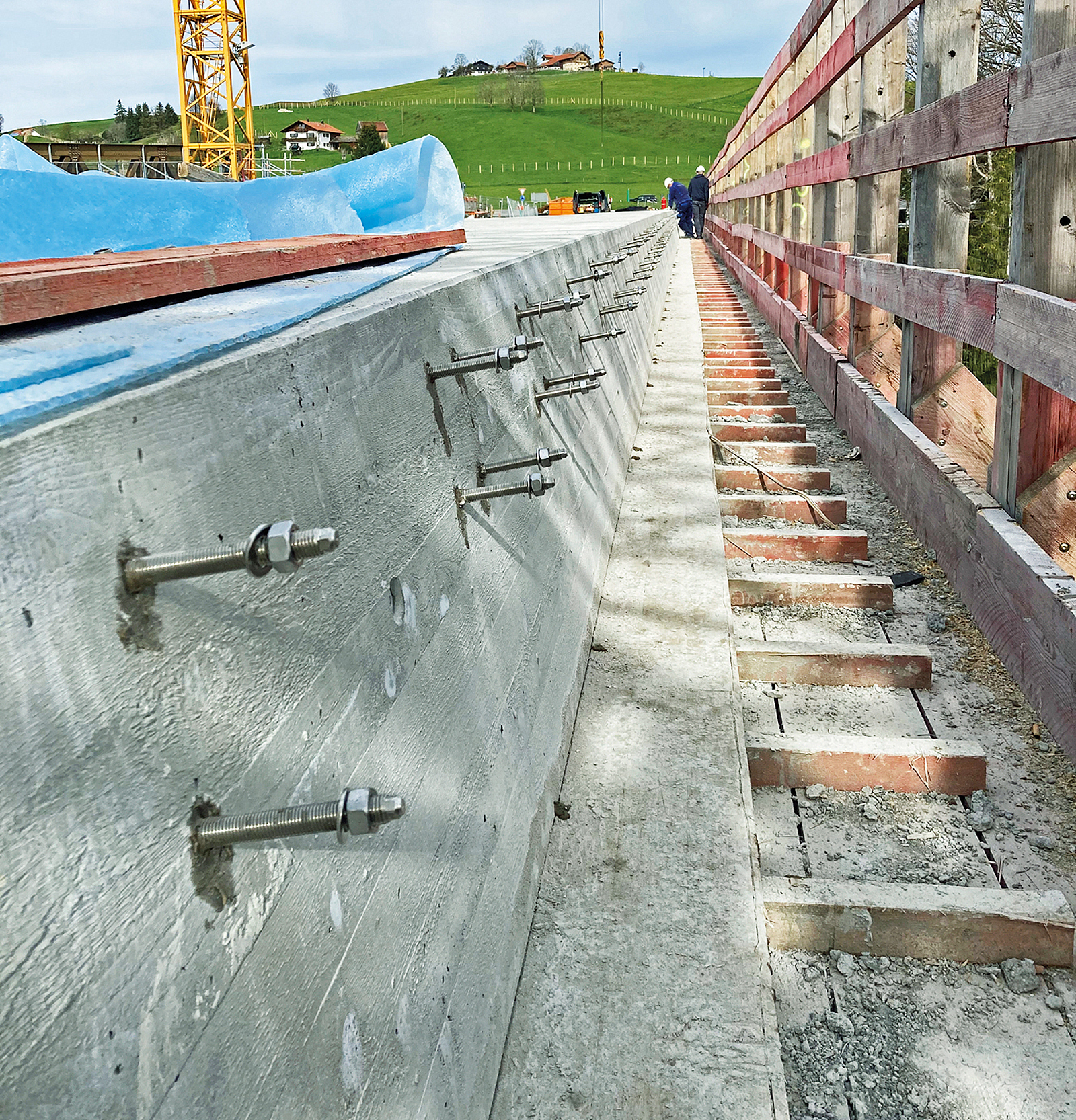 Zur sicheren Befestigung der 2,50 m hohen Stahl-Geländer in Sonderbauweise an den Beton der Brückenkappe entschied sich der Tragwerksplaner für eine Befestigungslösung der Unternehmensgruppe fischer. Eingesetzt wurde der fischer Injektionsmörtel FIS HB zusammen mit ca. 2.500 fischer Ankerstangen FHB II AL M16 × 160 A4 aus nicht rostendem Stahl. Ausführender Betrieb war die Schallschutz Schröder GmbH aus München.