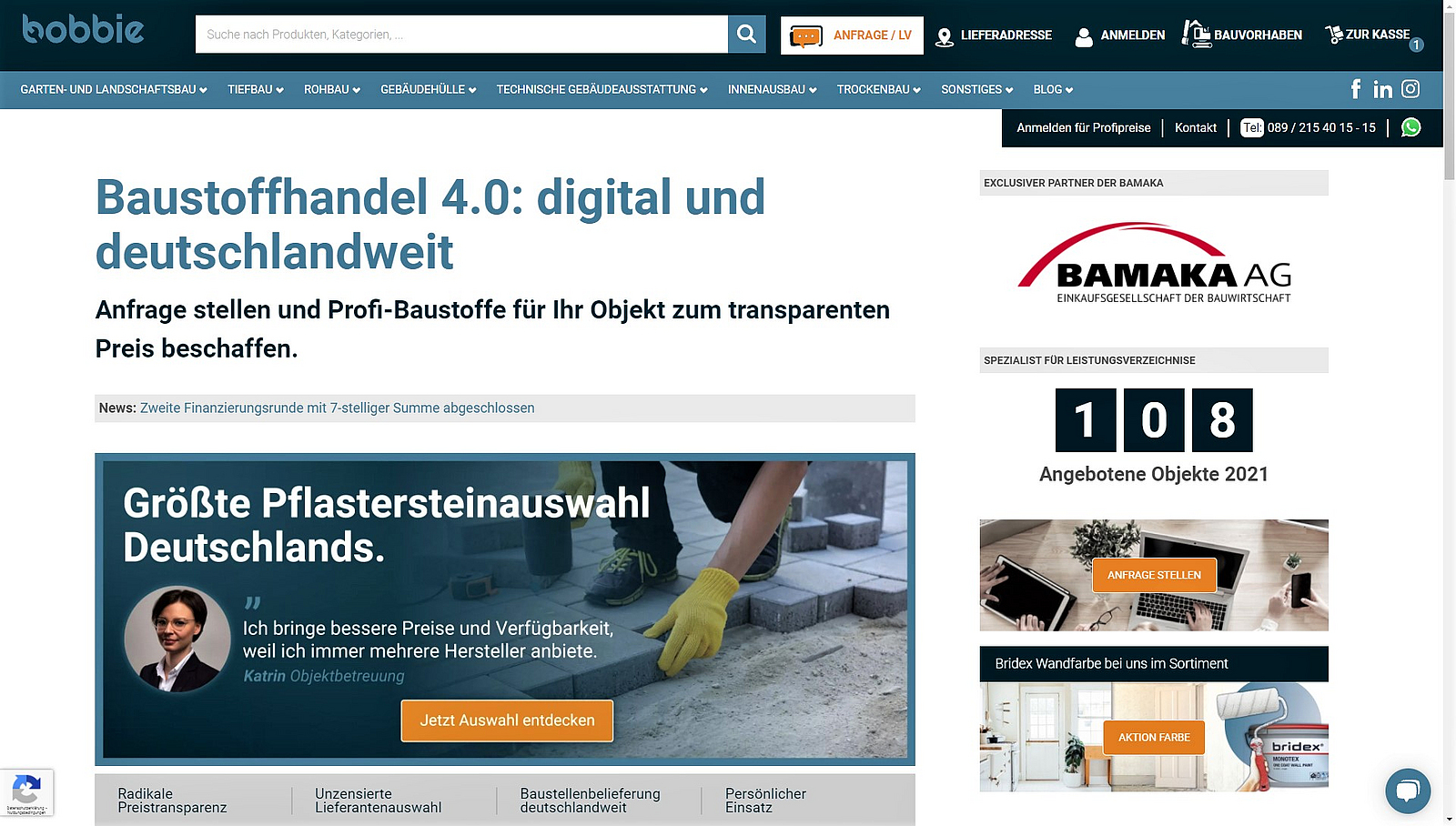 „bobbie“ ist ein digitaler Baustoffhändler für Herstellerfirmen von Baustoffen und für kaufinteressierte Profi- und Privatkundschaft: Bauunternehmen, Bauherrinnen und Bauherren, Architektinnen und Architekten, Planende. Das Start-up bietet mit 1 bis 4 %-Marge günstigere Preise als der stationäre Handel. Zurzeit hat „bobbie“ 200 Herstellerfirmen gelistet.
