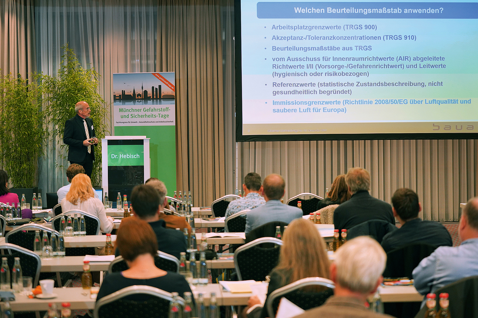 Mit der Bewertung der Messergebnisse beschäftigte sich der Vortrag von Dr. Ralph Hebisch von der Bundesanstalt für Arbeitsschutz und Arbeitsmedizin (BAuA). Die Bewertung ist abhängig von der Tätigkeit. So unterliegen Tätigkeiten mit Gefahrstoffen der Gefahrstoffverordnung und müssen entsprechend der Gefahrstoffverordnung bewertet werden. Anders ist es mit Tätigkeiten, bei denen es aufgrund externer Kontaminationen zu einer Belastung durch Gefahrstoffe kommt. Bei diesen Tätigkeiten ist die Arbeitsstättenverordnung anzuwenden.