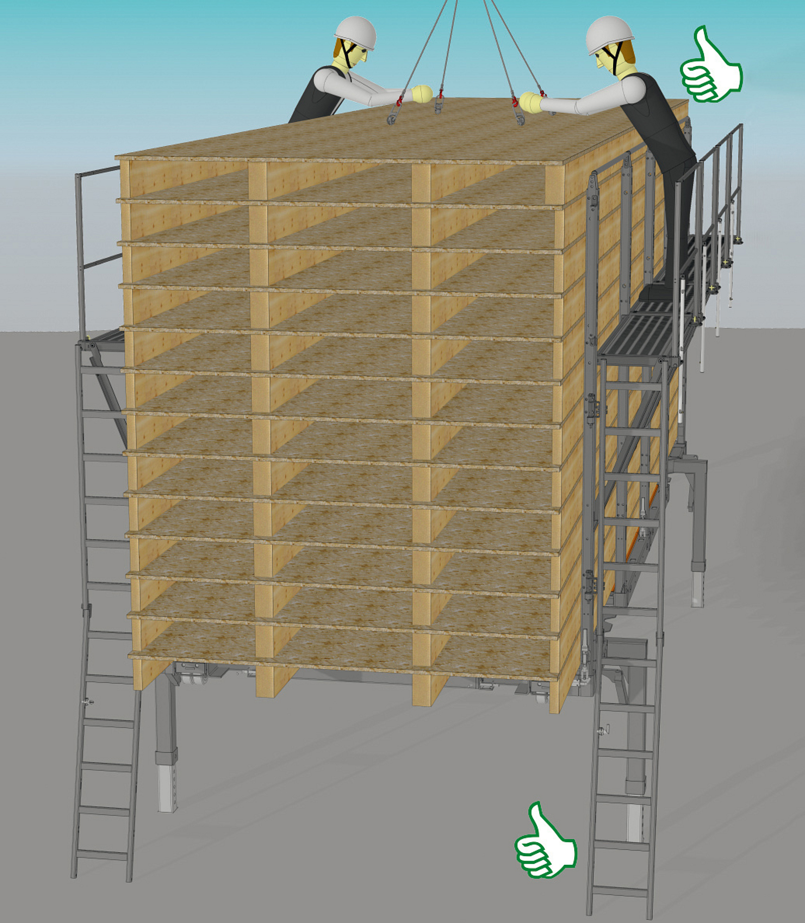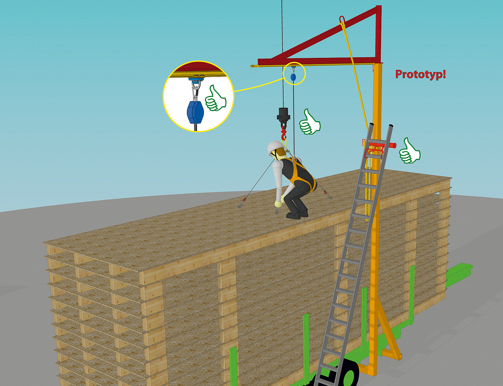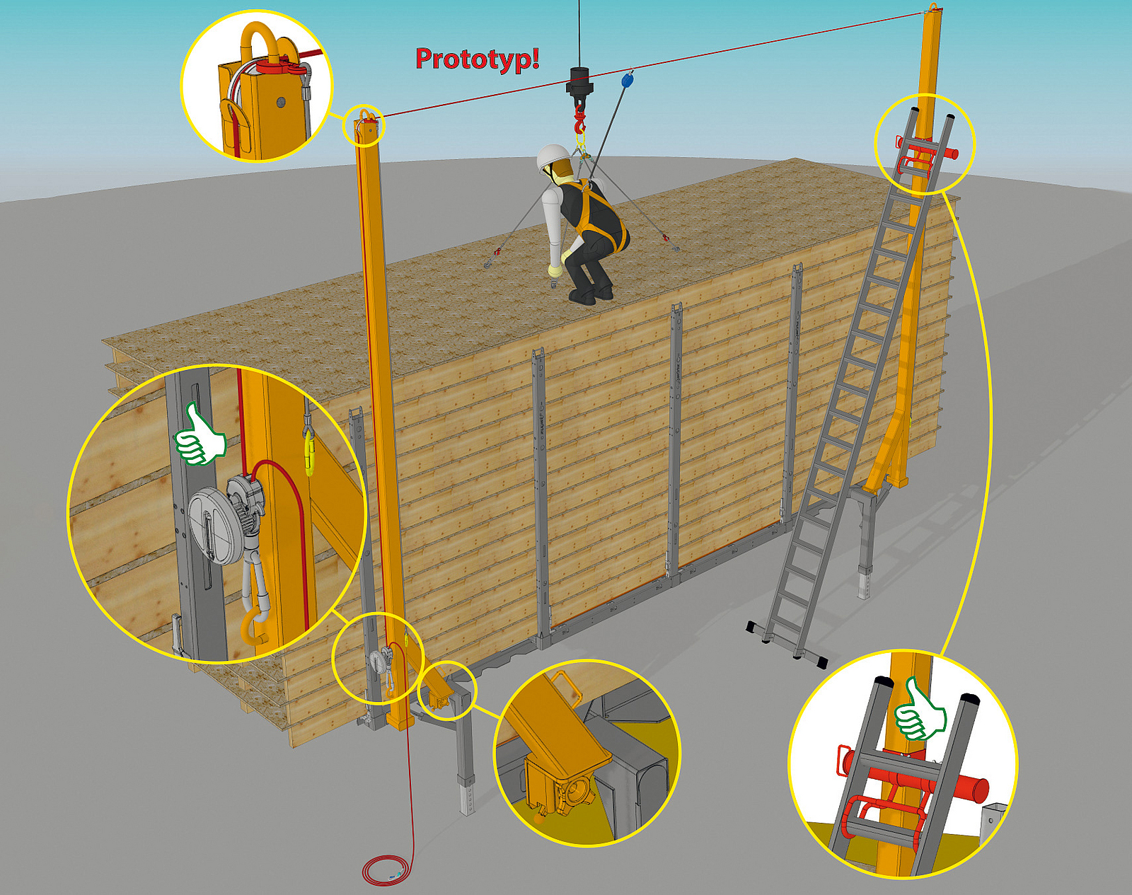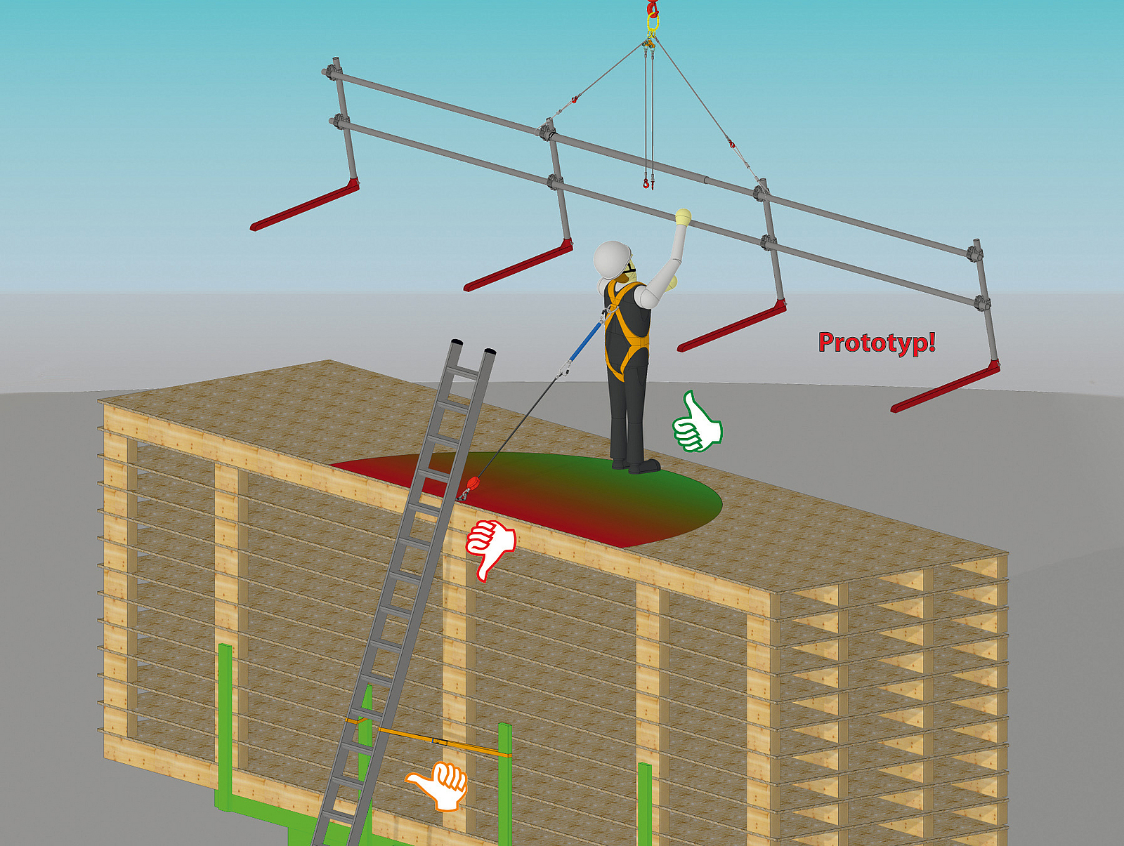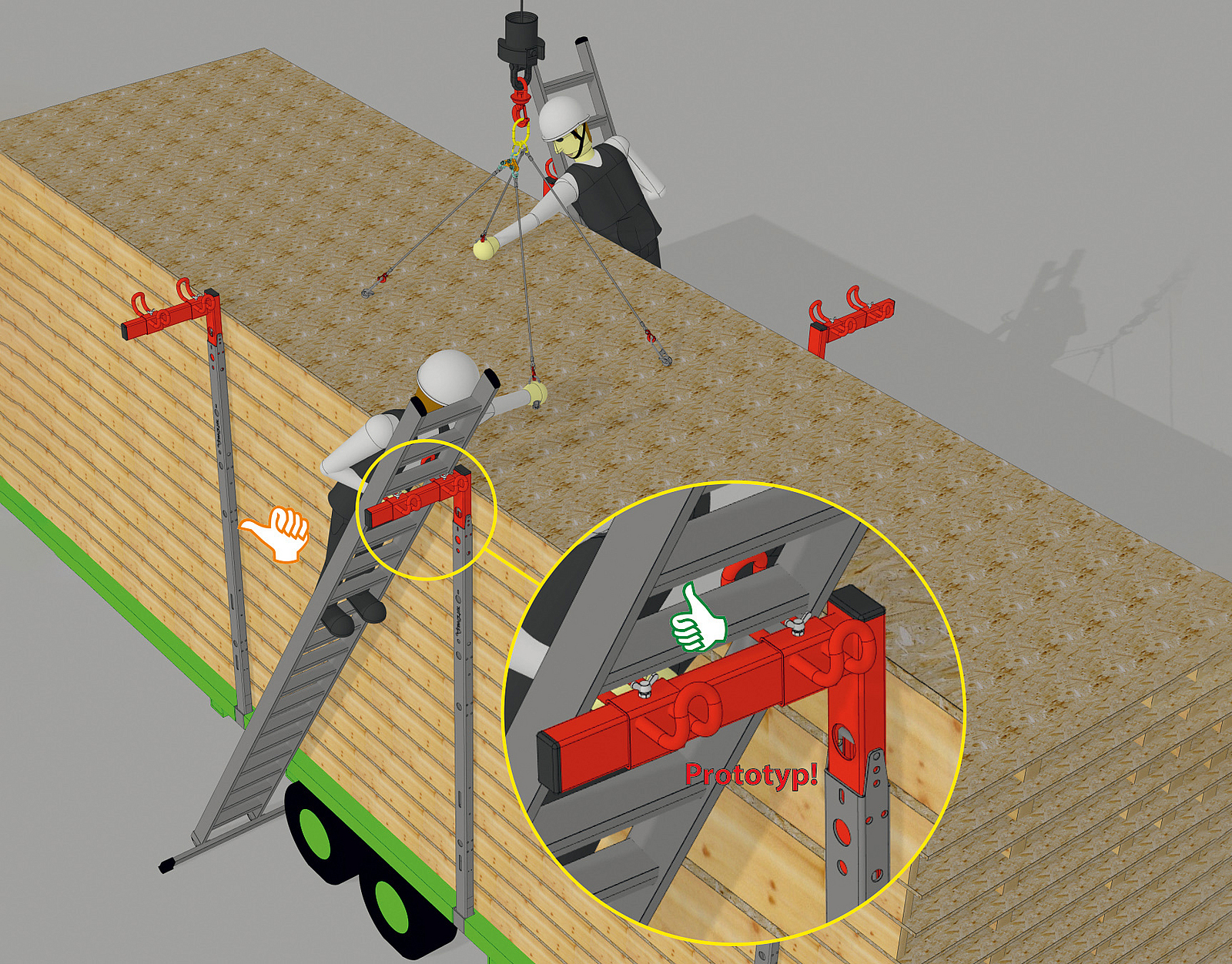 Baustellen sind etwas sicherer geworden. Ein Grund könnte sein, dass mehr auf geschlossenen Elementen, statt auf offenen Konstruktionen gearbeitet wird. Einen riskanten Arbeitsplatz gibt es aber noch: bis zu 4 m hohe Ladungen, auf denen Wand-, Decken- oder Dachelemente anzuschlagen sind. In diesem Artikel werden Maßnahmen und Produkte zur Absturzprävention vorgestellt, die es größtenteils noch nicht gibt. Betriebe und Hersteller sollen angeregt werden, diesen Arbeitsplatz sicherer zu machen.