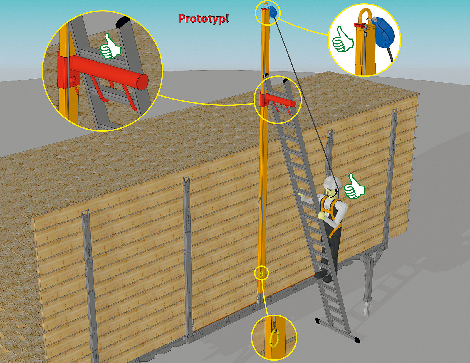 In Abb. 4 ist der Prototyp eines Masts zu sehen, der mit Kranunterstützung an der Außenrunge einer Wechselpritsche angebracht wird. Die Verbindung wird über einen Schnellverschluss hergestellt. Da das HSG über Kopf angebracht ist, liegt der günstigere Sturzfaktor 0 mit geringerer Falltiefe vor. Die Leiter ist unabhängig von der Ladung gesichert. Bereits beim Leiteraufstieg ist die Sicherung wirksam. Vor dem Aufrichten des Masts wird der Karabiner am Verbindungsmittel des HSG ausgezogen und am unteren Mastende an einem Griff eingehängt. Allerdings nimmt auch hier das Pendelsturzrisiko mit größer werdender Entfernung vom Mast zu.