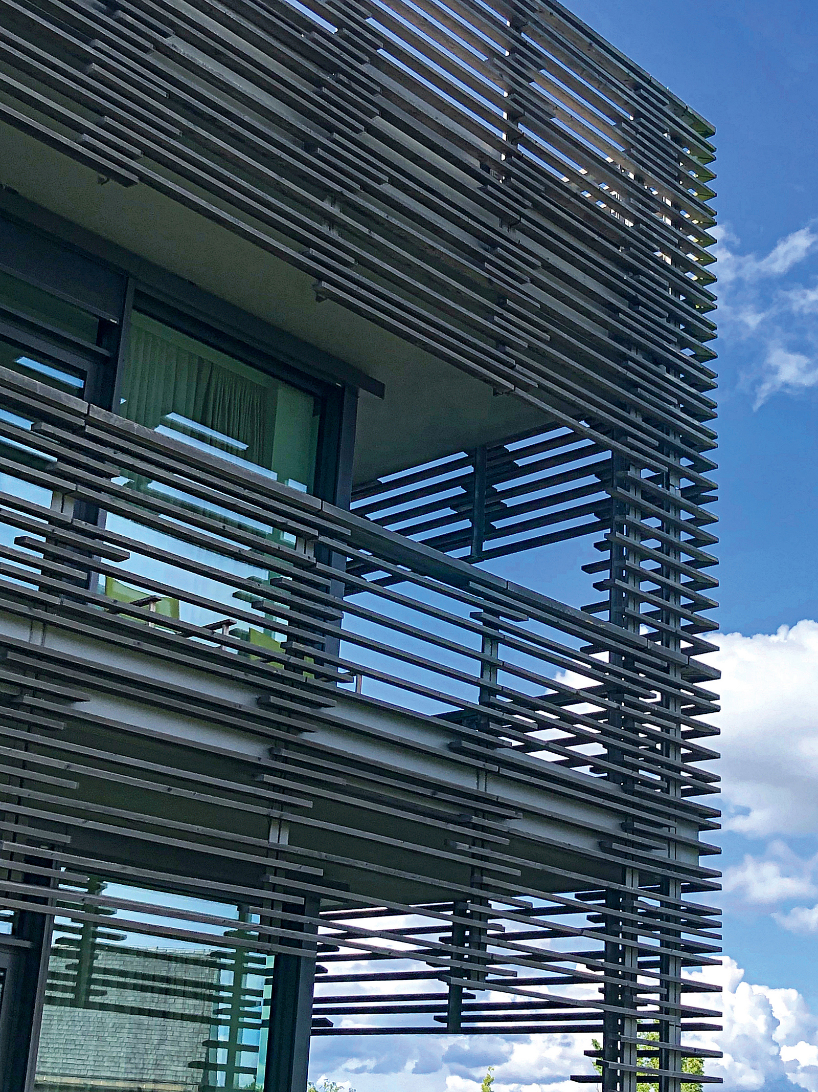 Die Fassade bietet weit mehr als eine einladende Optik. Durch die Anordnung der Lamellen und ihre teilweise Überlappung werden die Geschossigkeit und die Struktur der Zimmer beim Anblick von außen überspielt. Durch den natürlichen Verwitterungsprozess des Holzes verwandelt sich die Fassadenverkleidung des Hotels im Lauf der Zeit von einem leichten Braunton in ein Silbergrau. Die Holzlamellenfassade dient zugleich als feststehender permanenter Sonnenschutz für die Gästezimmer. Hier wurden anhand der 3D-Planung in verschiedenen Varianten mehrere Simulationen durchgeführt, um sicherzustellen, dass für die Einhaltung des Wärmeschutzes der Temperatureintrag während der Sommerzeit nicht zu groß wird. Die Anordnung und die Dichte der Hölzer wurden von den beteiligten Experten so lange optimiert, bis ausreichend Verschattung gegeben war – und zugleich die bestmögliche Tageslicht-Nutzung bestehen bleibt. Insbesondere der Ausblick in die Umgebung von den Räumlichkeiten aus sollte für die Gäste maximal erlebbar bleiben. Als Basis hat die Holzlamellenfassade eine in regelmäßigen Abständen von höchstens 1,50 m positionierte vertikale Unterkonstruktion, bestehend aus jeweils zwei Stahlwinkelprofilen. Diese wurden an den Balkonkragplatten und auch zum Teil auf dem Gründach befestigt. Zwischen den vertikalen Profilen hat man horizontal verlaufende hölzerne Lamellen mit einem Querschnitt von 3 × 9 cm montiert, die im Regelfall in einem Achsabstand von ca. 15 cm zueinander liegen. Den oberen horizontalen Fassadenabschluss in jedem Geschoss bildet ein Handlauf. Dieser besteht aus Flachstahl mit einer darüberliegenden Abdeckung in Form eines Deckholzes. Montiert wurde die Fassade in einzelnen, vorgefertigten Modulen.