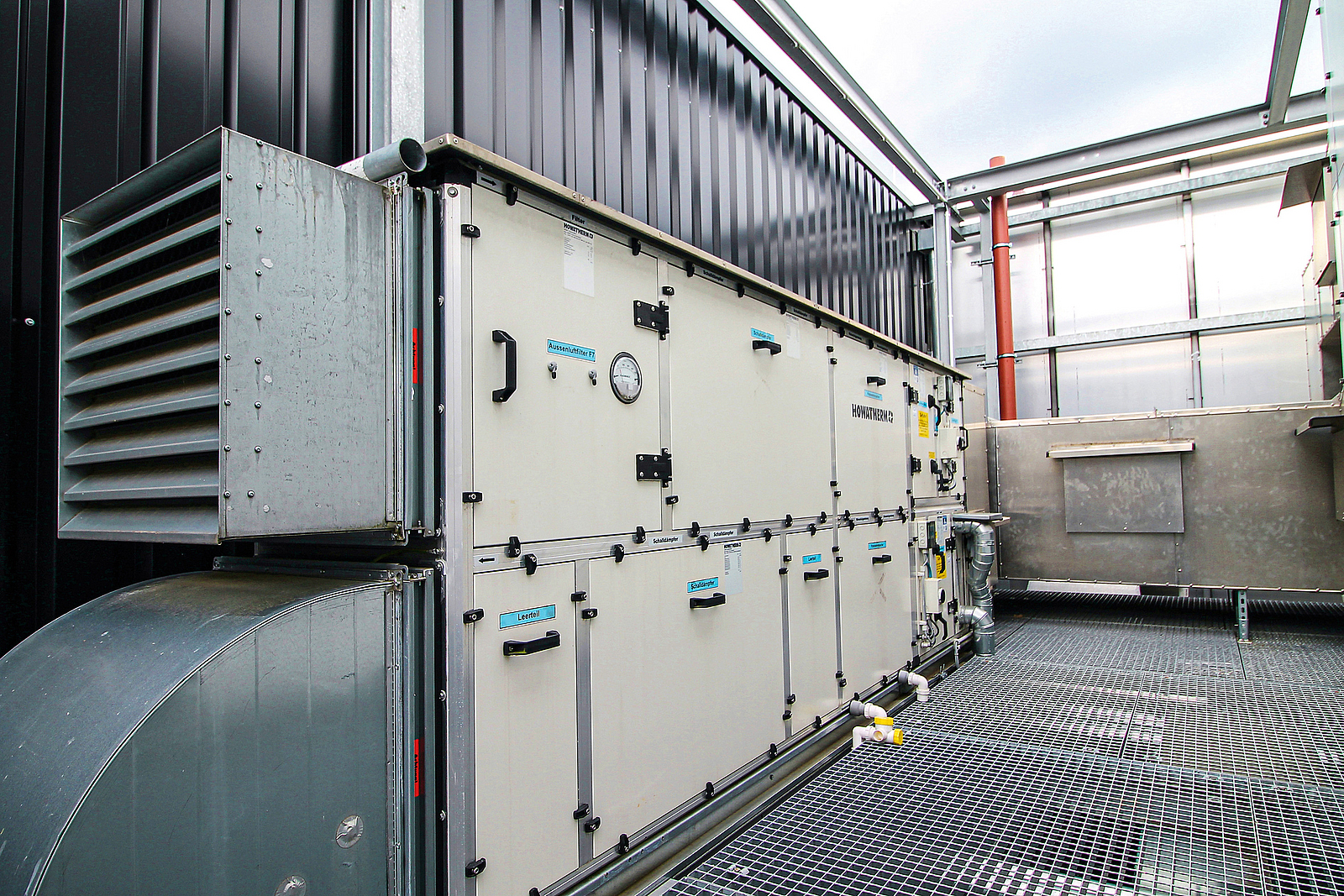 Darüber hinaus wurde die Dachfläche mit einem Geländer, das quasi die hochgezogene Fassade mit einem Handlauf ist, abgesichert, sodass Wartungs- und Instandhaltungsarbeiten an den Technikbauten sicher durchgeführt werden können.