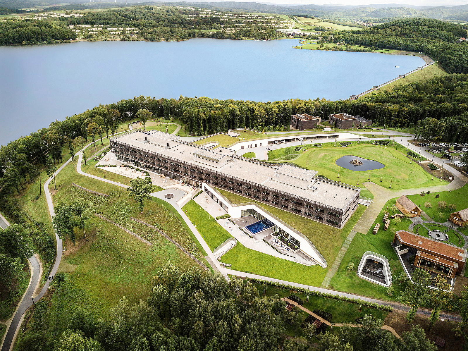 Hotelbauten sind oft Standardlösungen. Beim Designhotel Seezeitlodge im Norden des Saarlands ist das ganz anders. Das Projekt des Berliner Architekturbüros GRAFT glänzt nicht nur mit seiner exponierten Lage, sondern auch durch Nachhaltigkeit und Effizienz. So entstand am südöstlichen Ufer des Bostalsees ein Bauwerk in drei Vollgeschossen mit technisch und energetisch herausragenden Eigenschaften, das sich vorbildlich in seine natürliche Umgebung integriert. Highlight ist die kaum sichtbare Technikzentrale auf dem Dach.