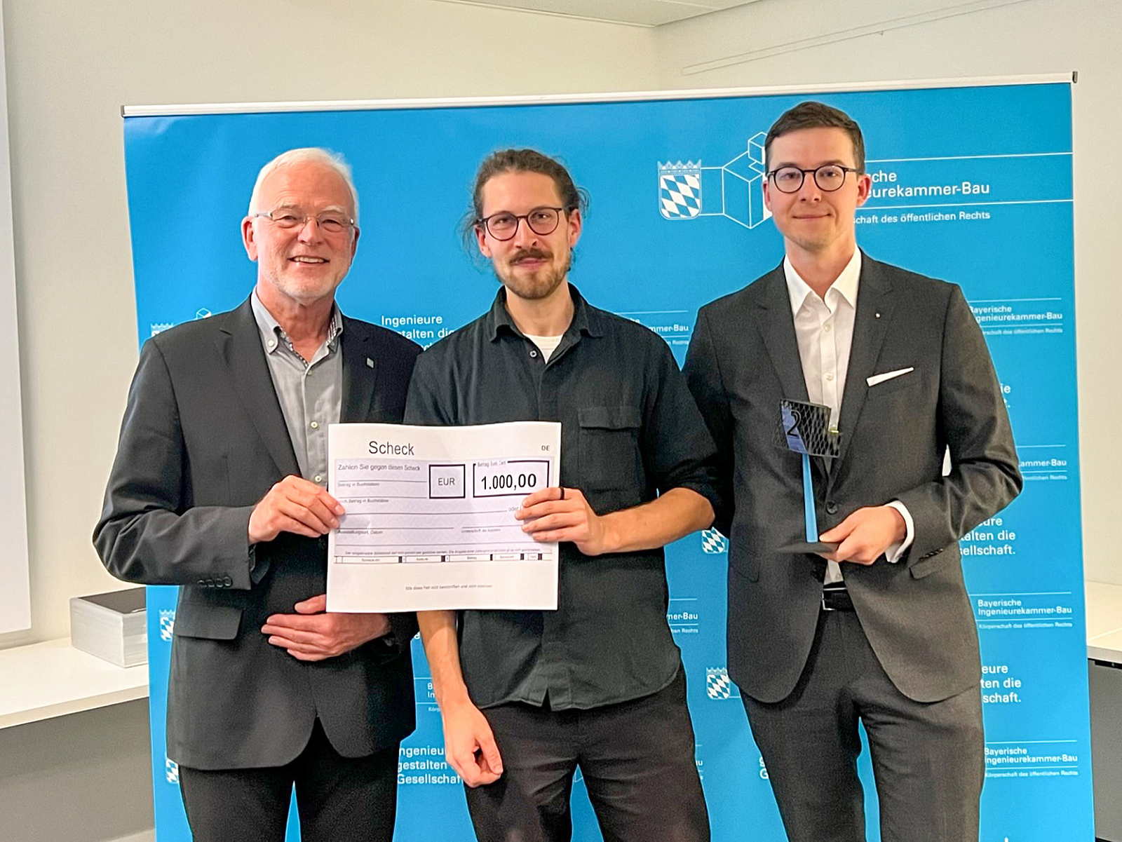 Niklas Haschke (m.) mit Kammerpräsident Prof. Dr. Norbert Gebbeken und dem Juryvorsitzendem Dr.-Ing. Michael Anton Kraus.