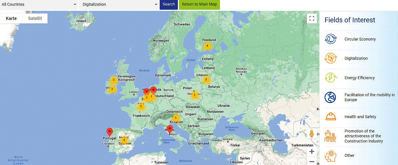 Für diese Karte haben die Projektpartner aus den zwölf Ländern unterschiedliche Best- Practice-Beispiele und innovative Initiativen (auf regionaler und nationaler Ebene) zusammengetragen, die sich mit Qualifikationsdefiziten und dem Missverhältnis zwischen Qualifikationsangebot und -nachfrage in den Bereichen Energieeffizienz, Digitalisierung, Kreislaufwirtschaft oder Gesundheit und Sicherheit am Arbeitsplatz befassen. Außerdem gibt es verschiedene Initiativen, die sich mit der Erleichterung der Mobilität in Europa und der Förderung der Attraktivität der Bauindustrie befassen.
