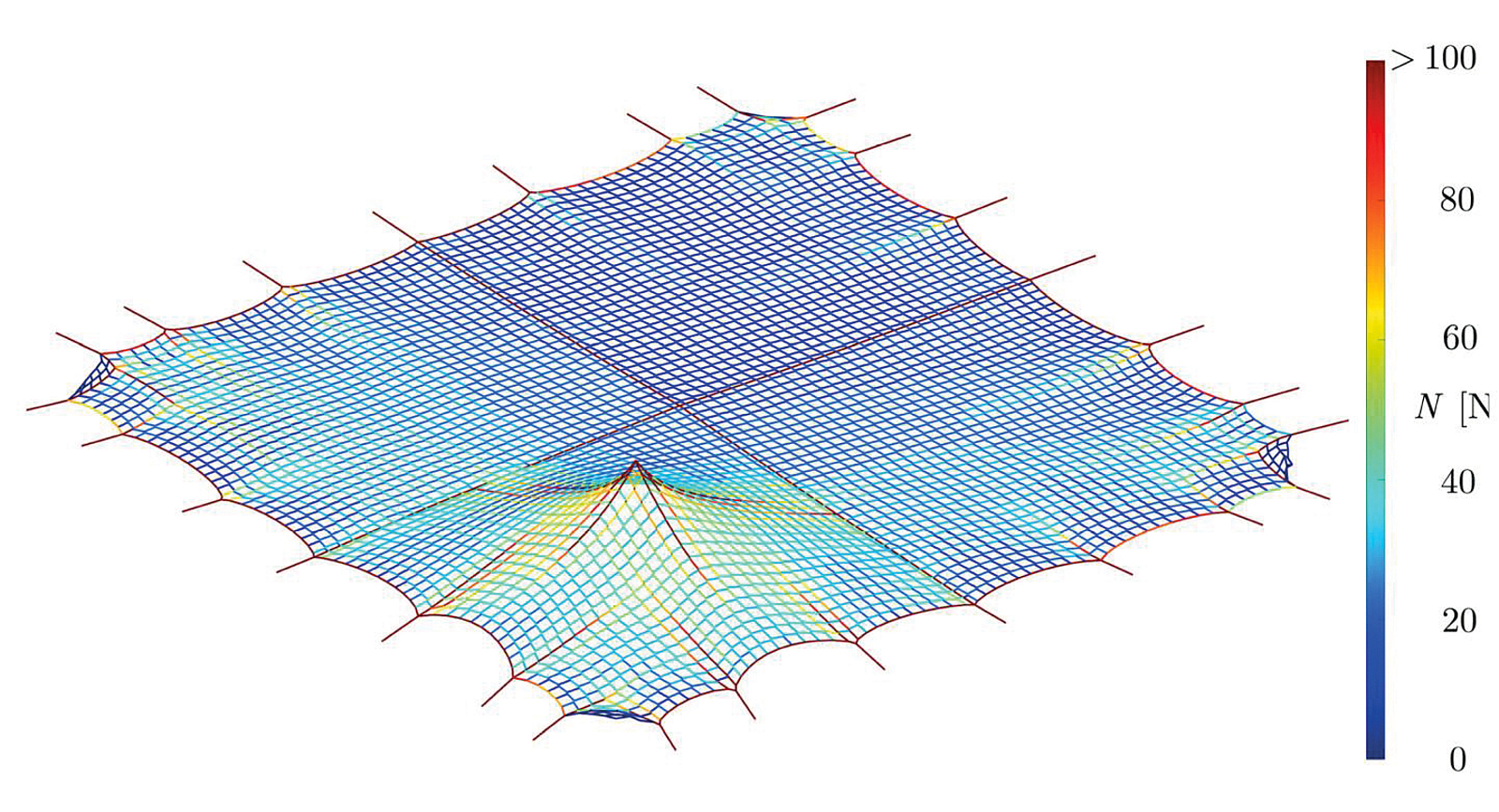 Die besonderen Herausforderungen bei der numerischen Simulation waren die physikalische wie auch die geometrische Nichtlinearität. Die Dehnung des Netzmaterials verhält sich keineswegs proportional zur aufgebrachten Kraft. Ebenso problematisch war es, die großen Verformungen korrekt abzubilden. Sämtliche Vereinfachungen, wie man sie aus der üblichen Baustatik kennt (sin(φ) = tan(φ) ͌ φ), würden die Berechnungen grob verfälschen.