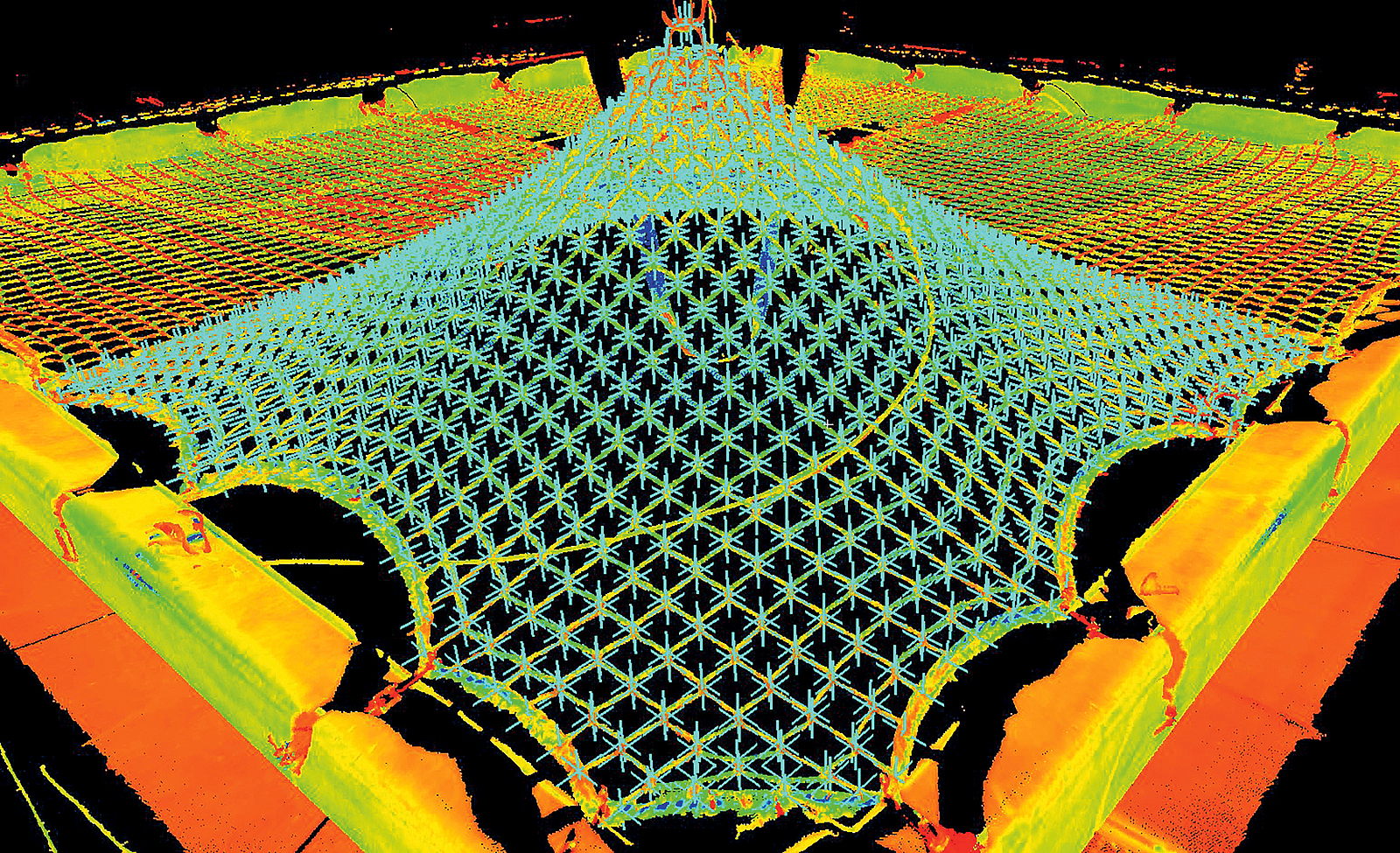 Für die Durchführung der Belastungsversuche im Labor wurde ein unbelastetes Netz in einen Stahlrahmen gespannt. An den Aufhängepunkten wurden Kraftsensoren angebracht. Um Daten zur Netzform vor der Belastung zu erhalten, wurden das Netz nach dem Aufhängen gescannt und die Vorspannkräfte ermittelt. Nachdem das Netz ausgelenkt wurde – also so belastet wurde, dass es sich verformt – scannte man es wieder und bestimmte die Kräfte in den Aufhängepunkten.