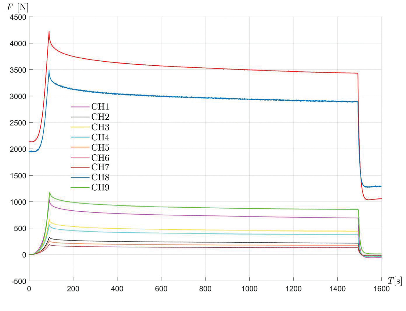 Die rote und blaue Kurve zeigen die beiden Spanngurte (Vorspannkräfte bei T=0). Die obere grüne Kurve zeigt die Last im Kranhaken. Die anderen Linien bilden die Kraftsensoren in den Aufhängepunkten ab.