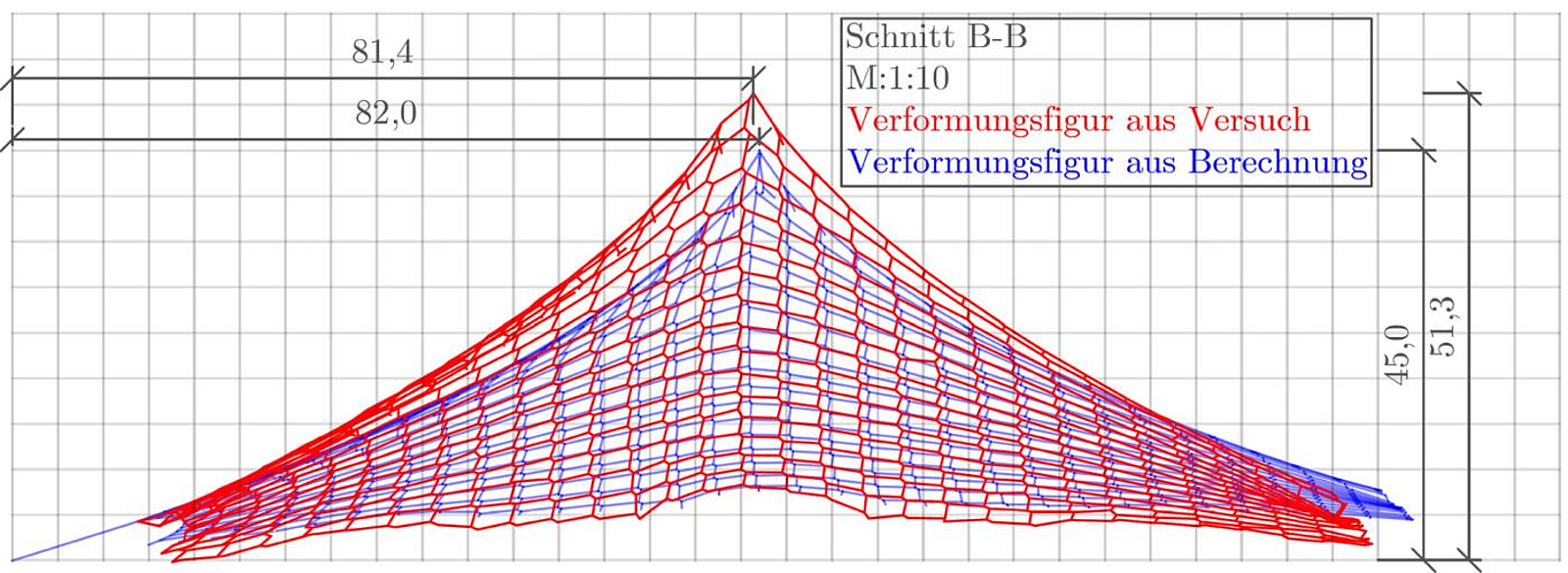 Die Netzform vor der Belastung und im ausgelenkten Zustand zeigte laut Scan erwartungsgemäß Unterschiede. Um die Verformungen des Netzes zu ermitteln, wurden auf den Netzmaschen Koordinatenkreuze platziert. Die Unterschiede der Koordinatenkreuze zeigen die Verschiebungen der Maschen an.