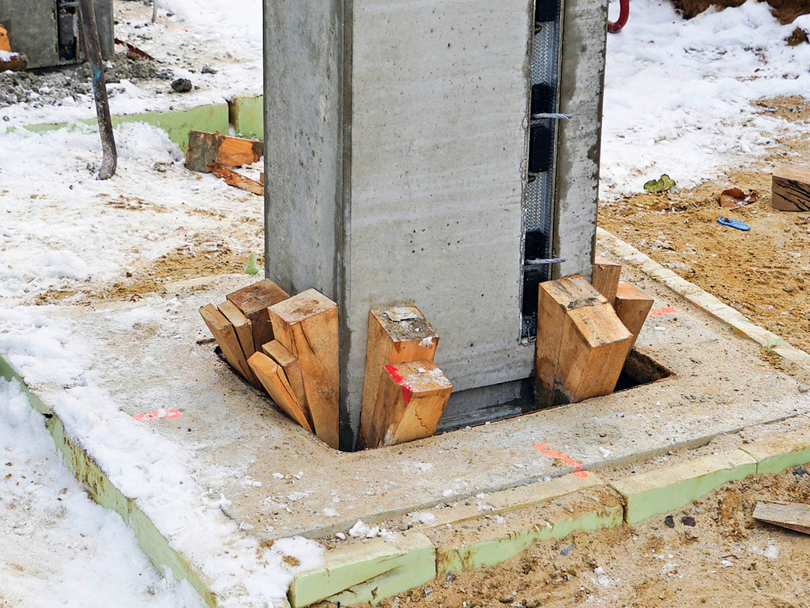 Für das Traggerüst wurden insgesamt 70 Rechteck-Stahlbetonstützen (20 m hoch) in den Boden gesetzt. Allein für das Schulgebäude waren es 30 Stützen. Sie gewährleisten, dass der Stützenquerschnitt über viele Geschosse gleich bleiben kann. Konsolen oder sonstige Wandanschlüsse lassen sich problemlos daran anbringen. Kaum jedoch vorstellbar ist, dass diese Giganten nur 70 cm tief stabil im Erdreich stehen. Kolja Gerke erklärt das Konstruktionsprinzip näher: „Wir gründen mit Köcherfundamenten, die aus jeweils einer unteren Stahlbeton-Fundamentplatte sowie dem aufstehenden Köcher bestehen. Mithilfe eines Krans werden die Stützen dann mittig hineingehoben und auf dem Dorn beweglich gelagert. Holzkeile am oberen Rand dienen der Zentrierung. Der jeweils verbliebene Hohlraum wird anschließend mit Beton verfüllt, um Köcherfundament und Stahlbetonstütze kraftschlüssig und dauerhaft zu verbinden. So ist die Stabilität garantiert gegeben. Die Holzkeile werden dann wieder entfernt und entstandene Vergusstaschen mit Beton verfüllt.“