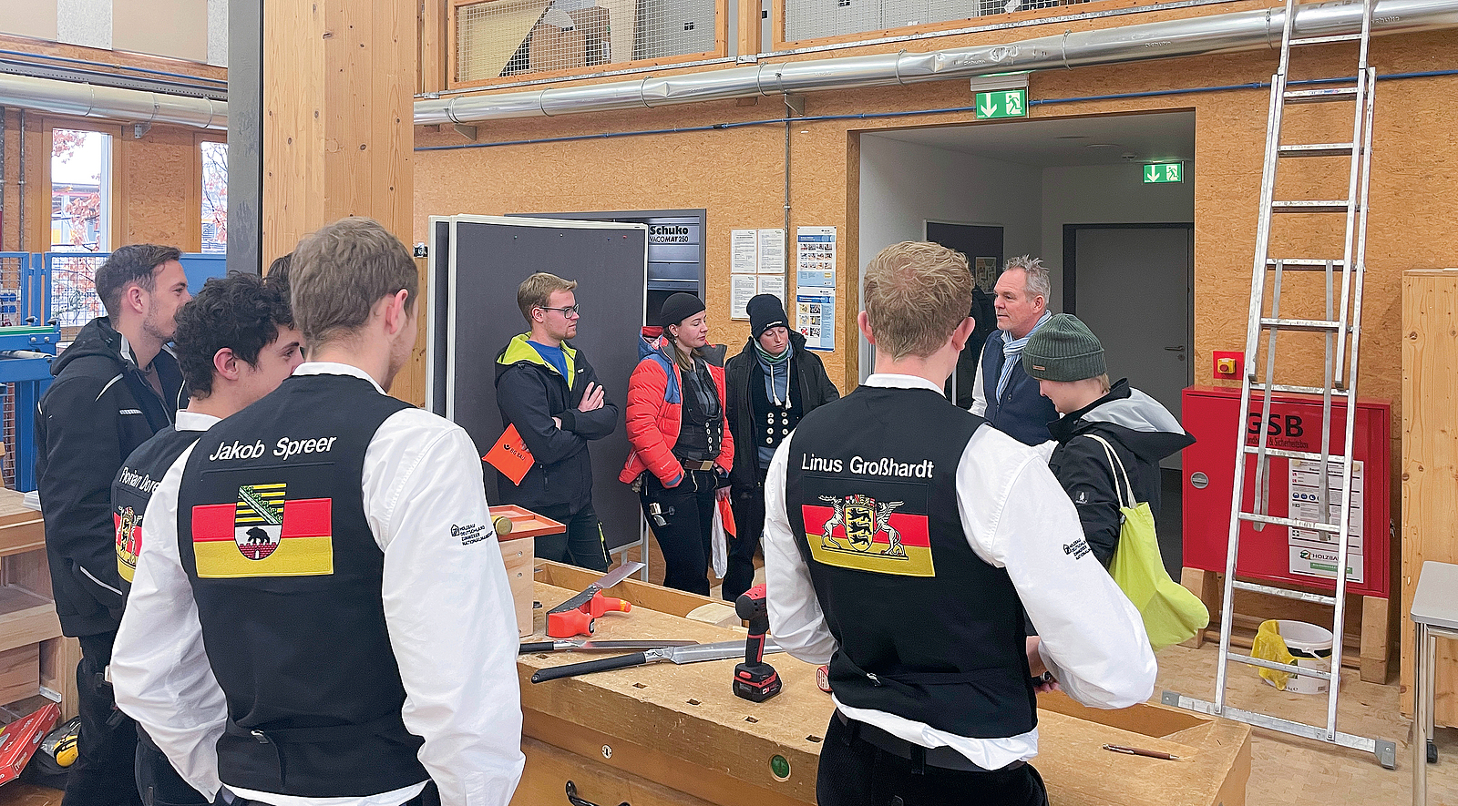 Etwa 50 Zimmererinnen und Zimmerer nahmen an dem von der BG BAU angebotenen Training im Bildungszentrum von Holzbau Baden-Württemberg in Biberach teil. Unter ihnen auch Vertreter der Nationalmannschaft: Jakob Spreer und Linus Großhardt, die sich über den Zimmerer Contest 2023 für die Nationalmannschaft qualifiziert haben, sowie Florer Dorer, Deutscher Meister der Zimmerer 2023.