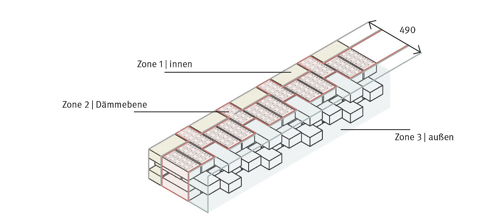 CAB-Außenwände sind in zweischaliger Ausführung geplant. Während die Hintermauerziegel gemäß dem sommerlichen Wärmeschutz Temperaturen in Innenräumen senken, reduziert die Außenfassade aufgrund der Selbstverschattung auch den Wärmeinseleffe