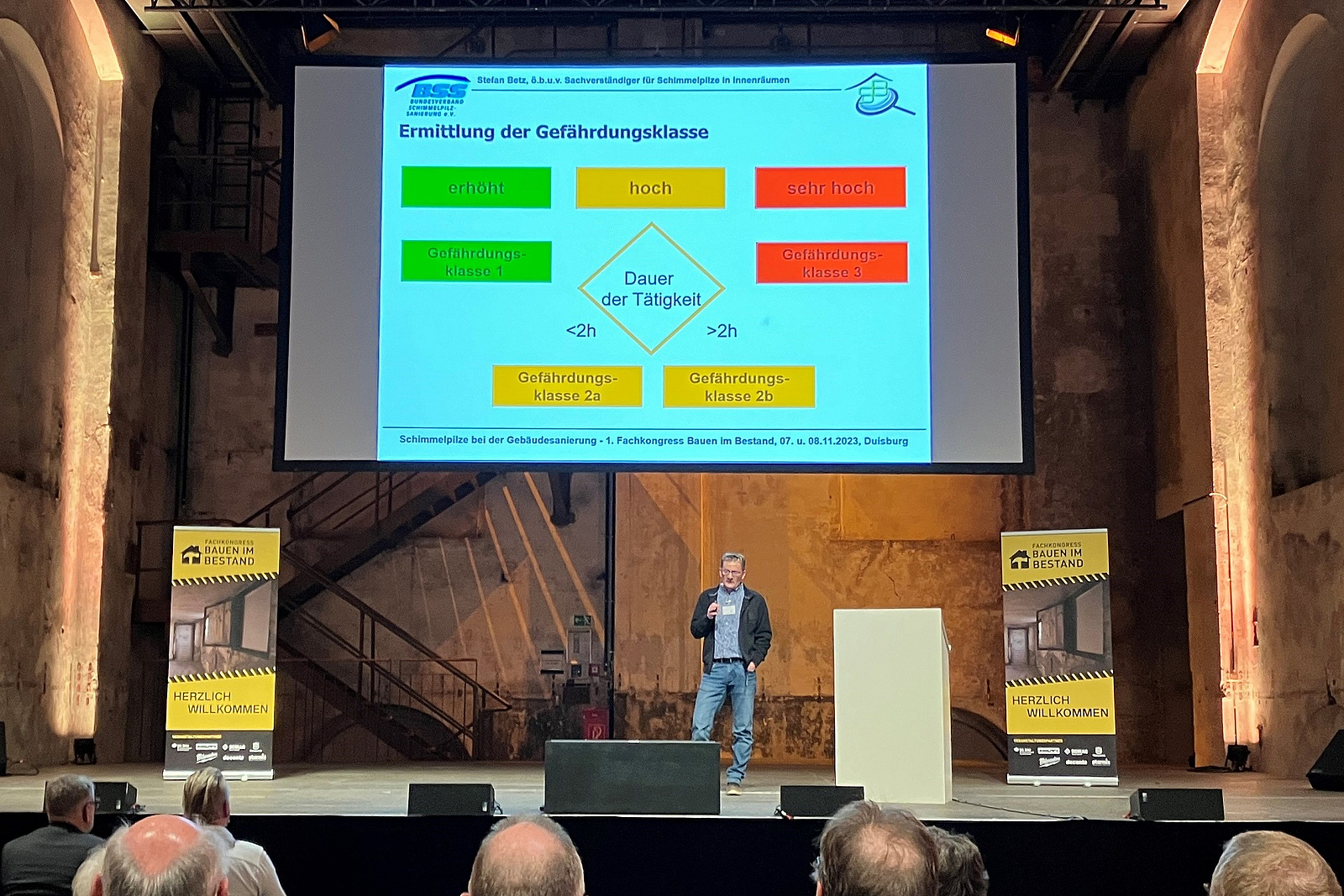 Um den Gefahrstoff Schimmelpilz, der auch nach wie vor in Bestandsbauten ein Thema ist, ging es im Vortrag von Stefan Betz vom Bundesverband Schimmelpilzsanierung e. V. (BBS). Er beschrieb, welche Maßnahmen notwendig sind, wenn Schimmelpilze bei der Gebäudesanierung auftauchen.