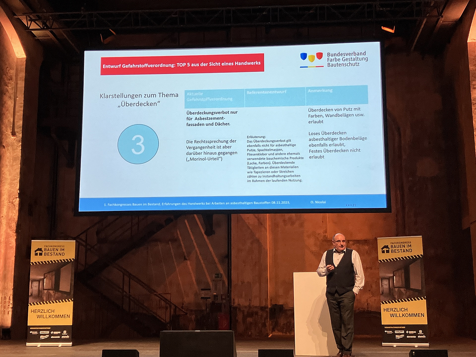 Einen Einblick in die Praxis ermöglichte der Fachvortrag von Dr. Oliver Nicolai vom Bundesverband Farbe Gestaltung Bautenschutz. Er berichtete, wie Handwerksunternehmen bei Arbeiten an asbesthaltigen Bauten bzw. Baustoffen vorgehen.