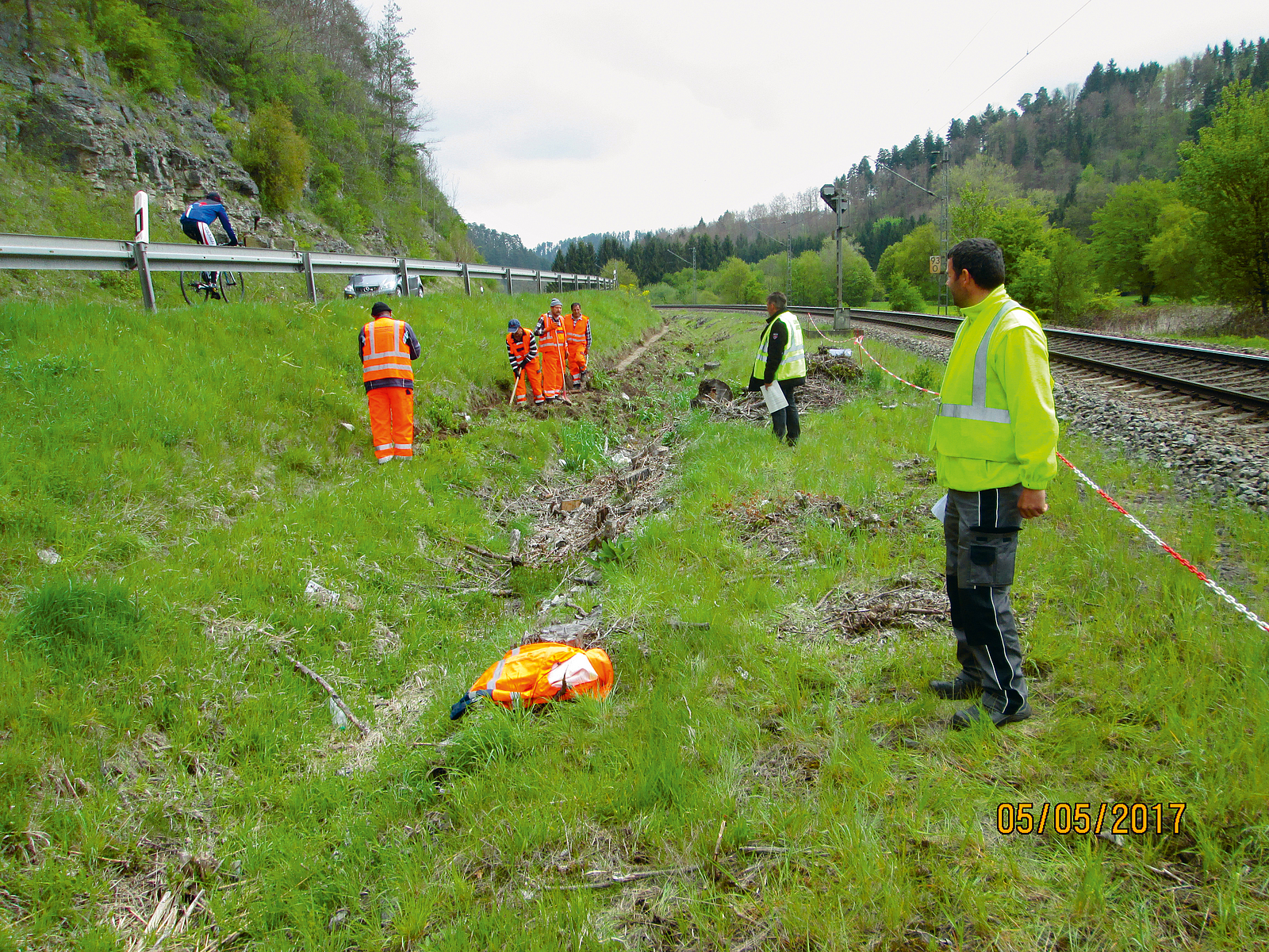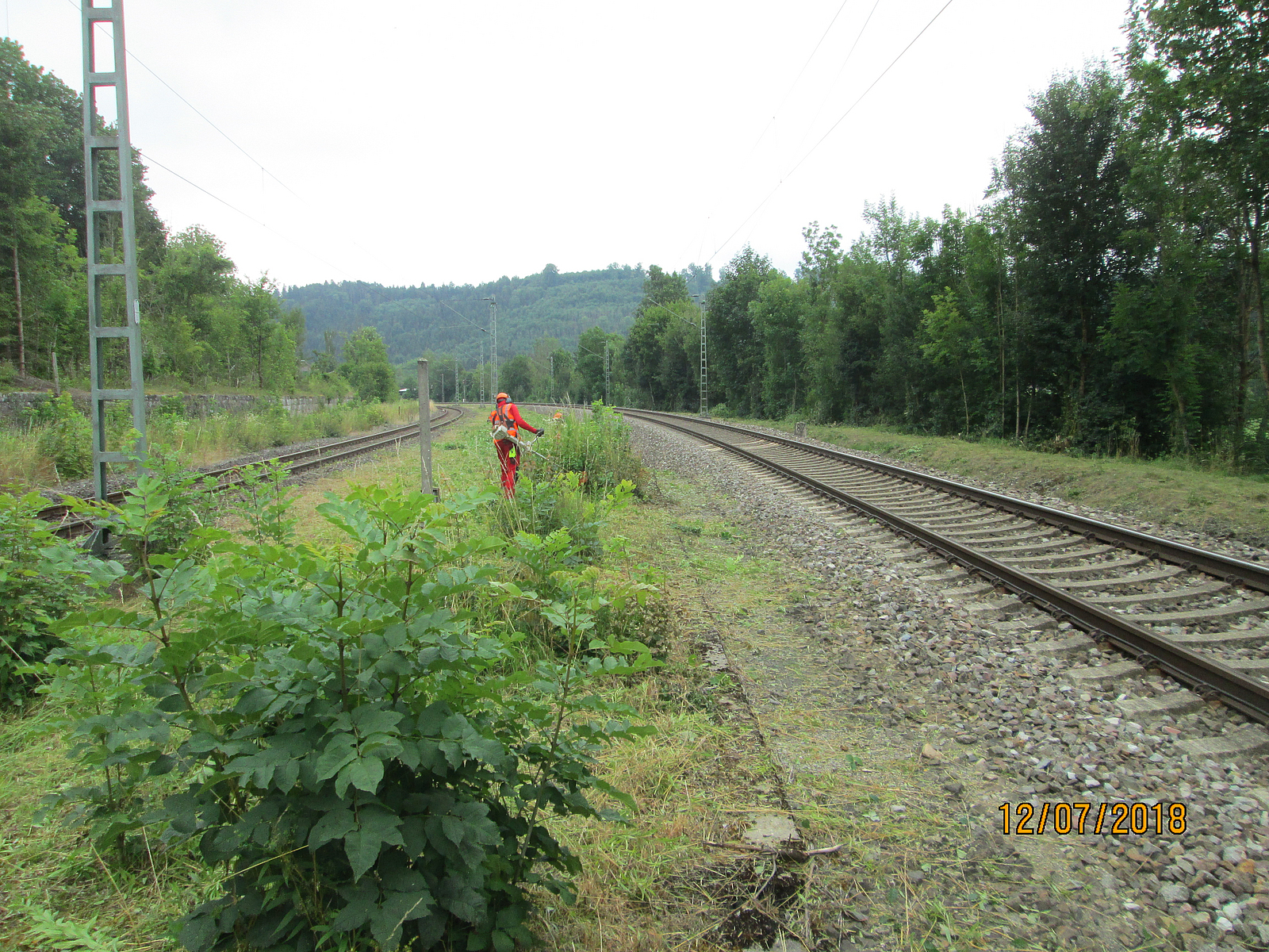 Vegetationsarbeiten zwischen Gleisen bis zur Schotterkante, also neben und bis in den Gleisbereich hinein, bei voller Konzentration auf die Arbeit – ohne Sicherungsmaßnahme, nur mit Einweisung.