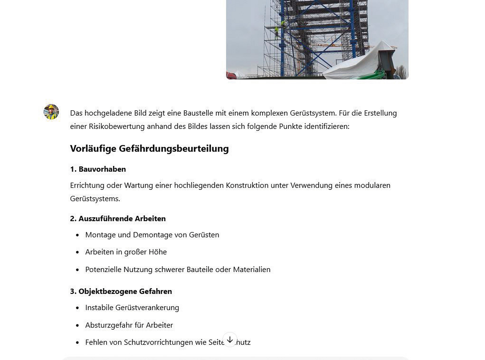 Ein Gerüstbauunternehmen zeigt, dass sich Gefährdungsbeurteilungen mithilfe künstlicher Intelligenz (KI) erstellen lassen. Dafür verarbeitet ein Chatbot Auftragsdaten und Rahmenbedingungen der Baustelle. Die KI wird stetig mit neuen Trainingsdaten verbessert und soll künftig auch Bildinformationen verarbeiten können.