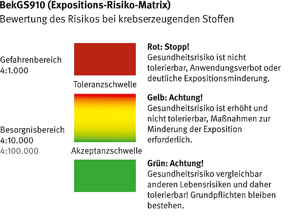 Auf Basis toxikologischer Erkenntnisse werden in Deutschland für krebserzeugende Stoffe Toleranz- und Akzeptanzkonzentrationen festgelegt. Liegt die Exposition am Arbeitsplatz unterhalb der Akzeptanzkonzentration sind keine stoffspezifischen Maßnahmen zum Schutz vor der inhalativen Aufnahme des Stoffes erforderlich, ggf. aber Maßnahmen zum Schutz vor Hautkontakt mit hautresorptiven Stoffen wie PAK.