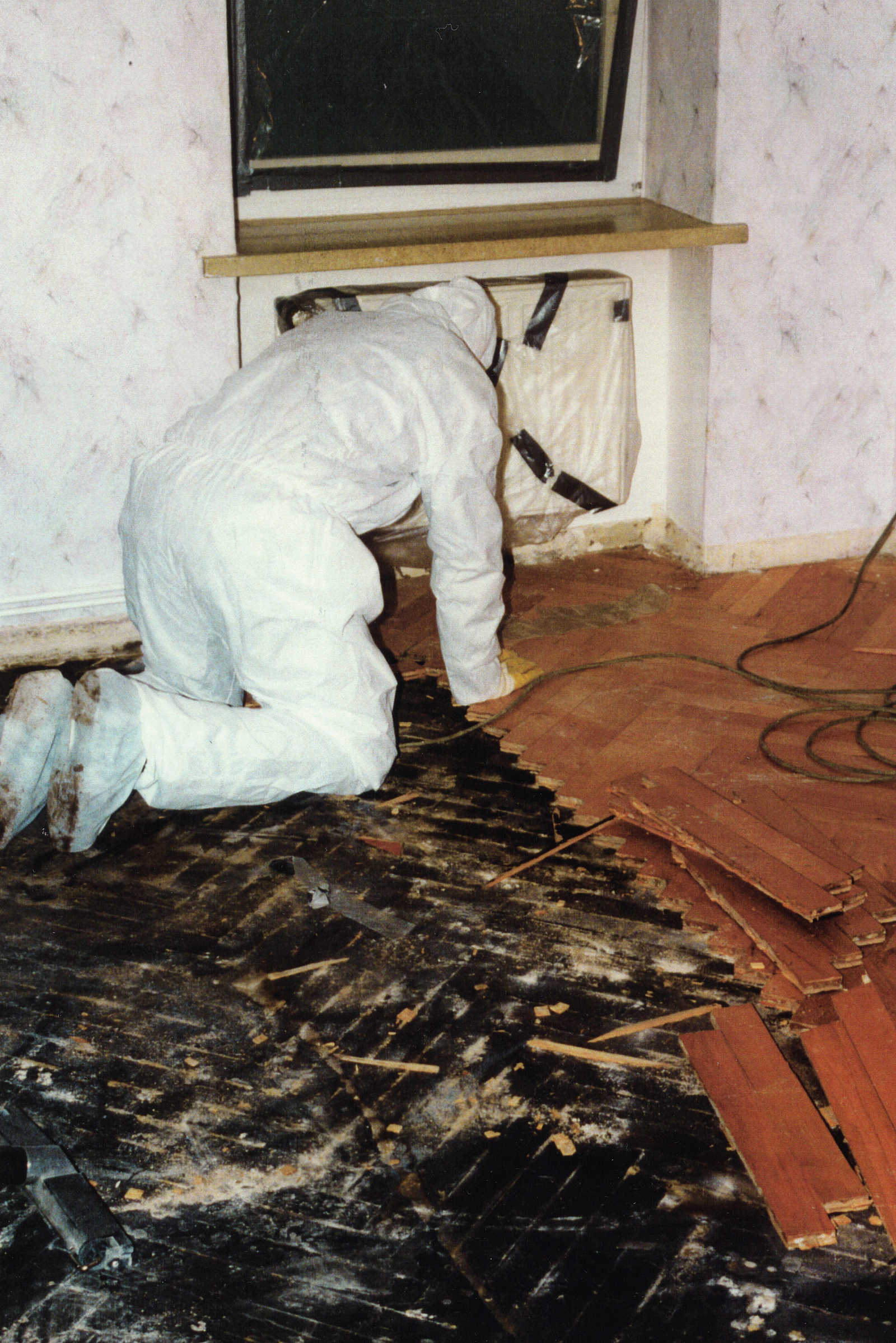 Bei der Sanierung von Parkett müssen oft PAK-haltige Parkettklebstoffe entfernt werden. Zum Schutz vor PAK-Exposition muss entsprechende Schutzkleidung getragen werden.
