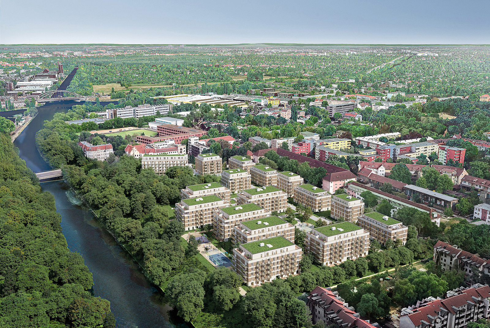 Die attraktive Wohnlage neben Teltowkanal und nahem Tempelhofer Feld in Neukölln könnte nicht besser sein. Hier entsteht auf rund 36.000 m2 ein interessantes Wohnquartier. Interessant deshalb, weil es die langjährige Brache des einstigen Spaßbads „Blub“ wiederbelebt sowie energieeffizientes, schnelles, bezahlbares sowie mietpreisgebundenes Wohnen mitten im Grünen vereint. So jedenfalls formuliert es der gemeinsame Anspruch der Projektentwickler Bauwens, des Investors Greystar und des Bau- und Dienstleistungsunternehmen Goldbeck sowie der landeseigenen Wohnungsgesellschaft Berlinovo.