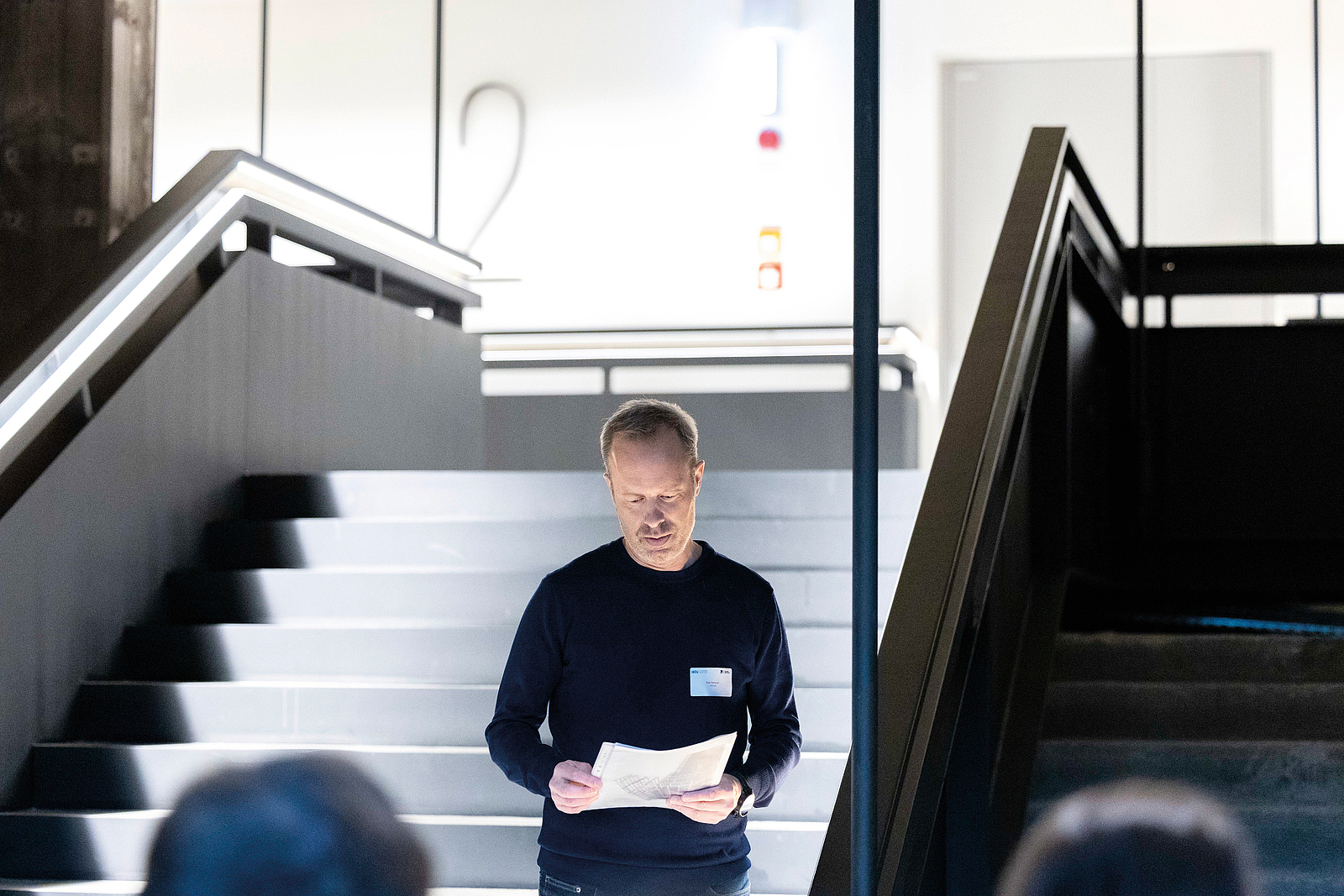 Im Treppenhaus des Towers erläuterte Architekt Pat Tanner, wie dort alte und neue Elemente gemäß dem Motto „Think around the corner“ verbunden wurden.
