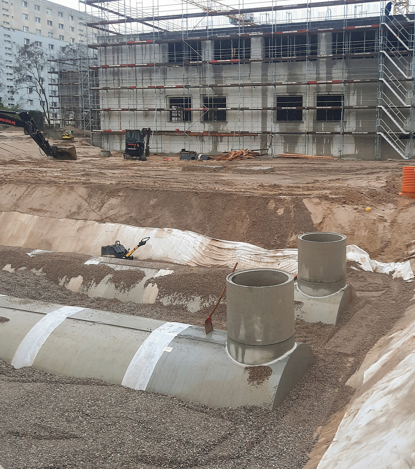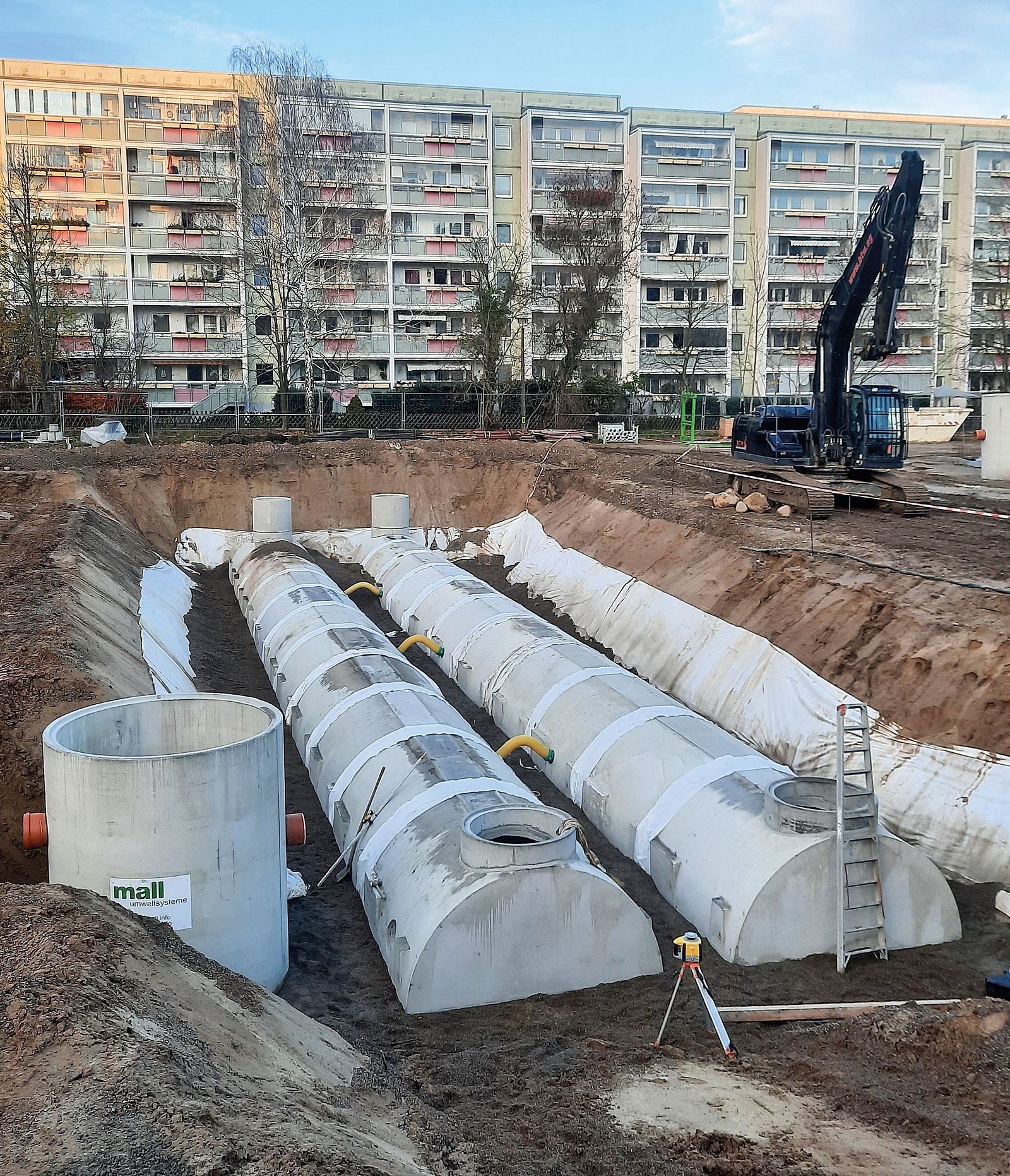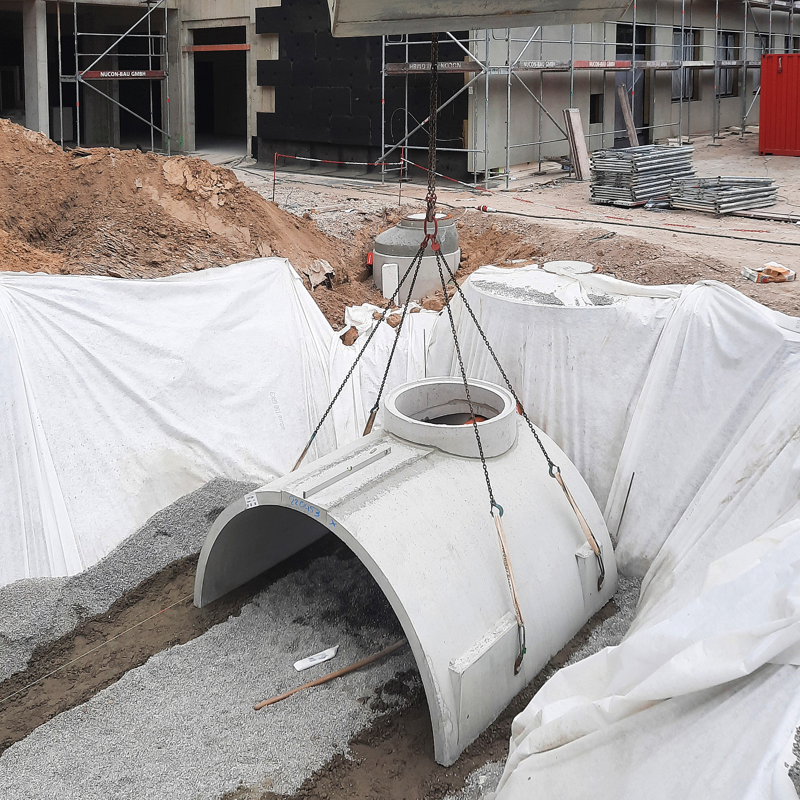 Das gefilterte Regenwasser gelangt dann in die zwei Sickertunnel. Sie bestehen aus jeweils elf Betonelementen und sind damit noch größer dimensioniert als die oben beschriebenen Anlagen. In den Tunnelrigolen lassen sich Niederschlagsmengen von insgesamt mehr als 134 m³ aufnehmen, die über Verbindungsleitungen zwischen den Röhren gleichmäßig verteilt werden. Zusätzliches Retentionsvolumen stellt das in die Baugrube eingebrachte Füllmaterial bereit. Final erfolgt die kontrollierte Versickerung ins Grundwasser.