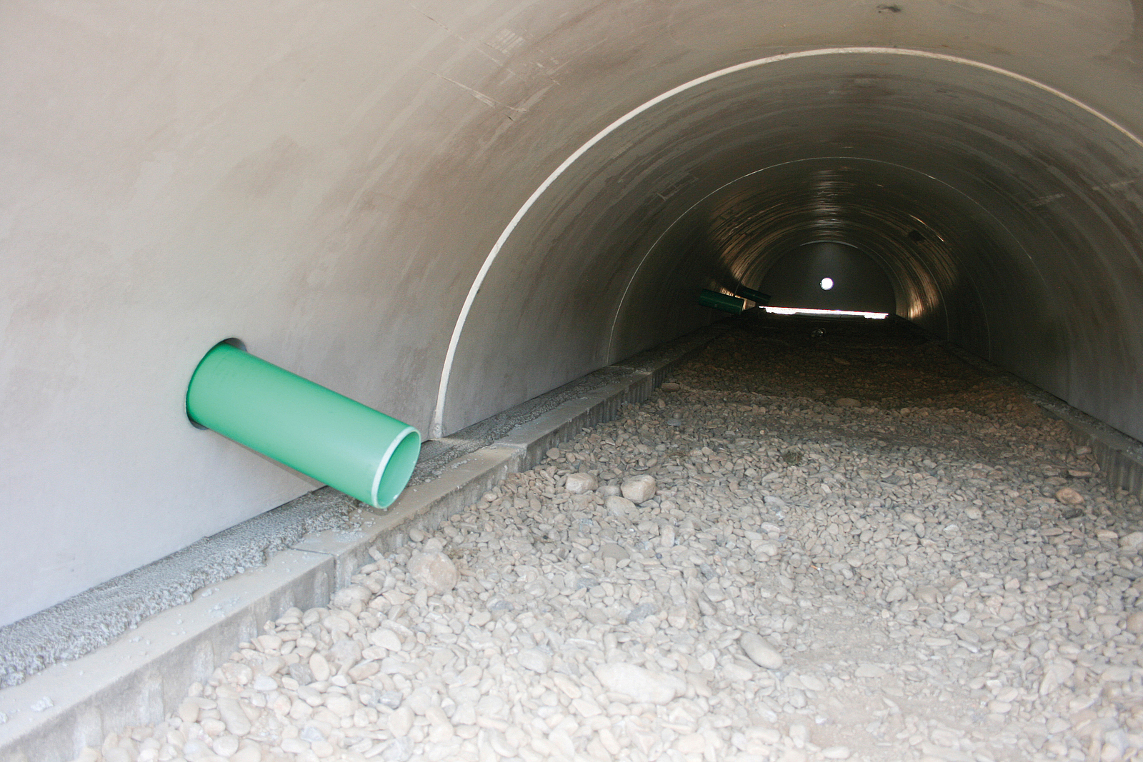 Die Montage der Sickertunnel wurde durch ihre Modulbauweise erleichtert. Beide Anlagen bestehen aus sechs Stahlbeton-Elementen, die bequem vor Ort zusammengesetzt wurden. Der Werkstoff Beton erlaubte zudem den Verzicht auf eine Geotextilummantelung. Die Innenhöhe von 1,25 m macht die Sickertunnel nach der Definition der Deutschen Gesetzlichen Unfallversicherung (DGUV) begehbar. Für Wartung und Betrieb ergeben sich dadurch erhebliche wirtschaftliche Vorteile, denn alle Maßnahmen können direkt und mit einfachen Werkzeugen erfolgen.