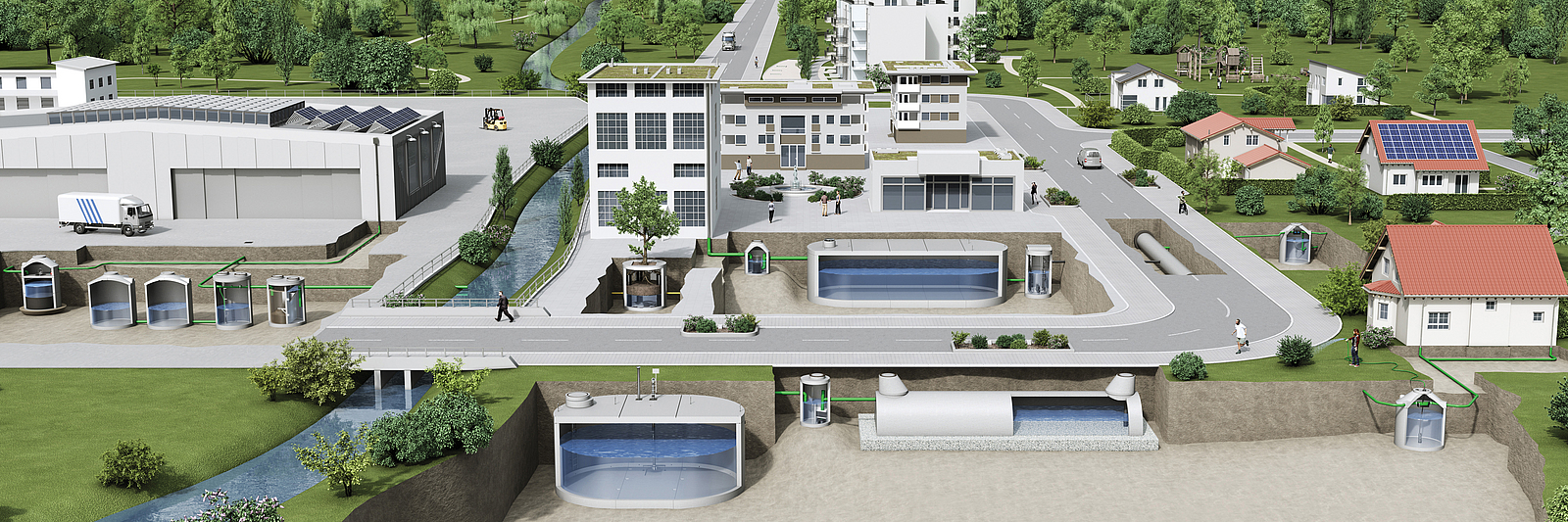 Kommunen müssen mit mehr Starkregen und längeren Trockenperioden umgehen und dafür moderne Konzepte beim Umgang mit Regenwasser in Betracht ziehen. Ein solches Konzept ist das Schwammstadt-Prinzip: Bei Starkregen wird das Regenwasser – anstatt ungenutzt abgeleitet zu werden – gespeichert, kontrolliert wieder an die Umgebung abgegeben oder zur Bewässerung der Vegetation genutzt. Dafür braucht man die sogenannte blau-grün-graue Infrastruktur. Diese entsteht durch die Verknüpfung von Wasserflächen wie Teichen und Seen (blau) mit Grünflächen wie Parkanlagen, begrünten Dächern und Fassaden sowie Stadtbäumen (grün) und grauen Infrastrukturelementen. Hierzu zählen technische Komponenten wie Zisternen, Pumpstationen und Versickerungsanlagen, die eine dezentrale Bewirtschaftung von Regen- und Niederschlagswasser ermöglichen. Anstatt das Wasser ausschließlich abzuleiten, wird ein möglichst naturnaher Kreislauf angestrebt: Das Nass wird gesammelt, gereinigt, zwischengespeichert, lokal genutzt, versickert oder teilweise abgeleitet.